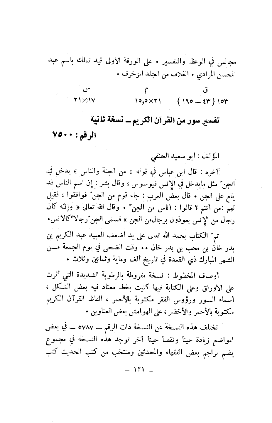 تفسير سور من القرآن الكريم- نسخة ثانية الرقم: 7500