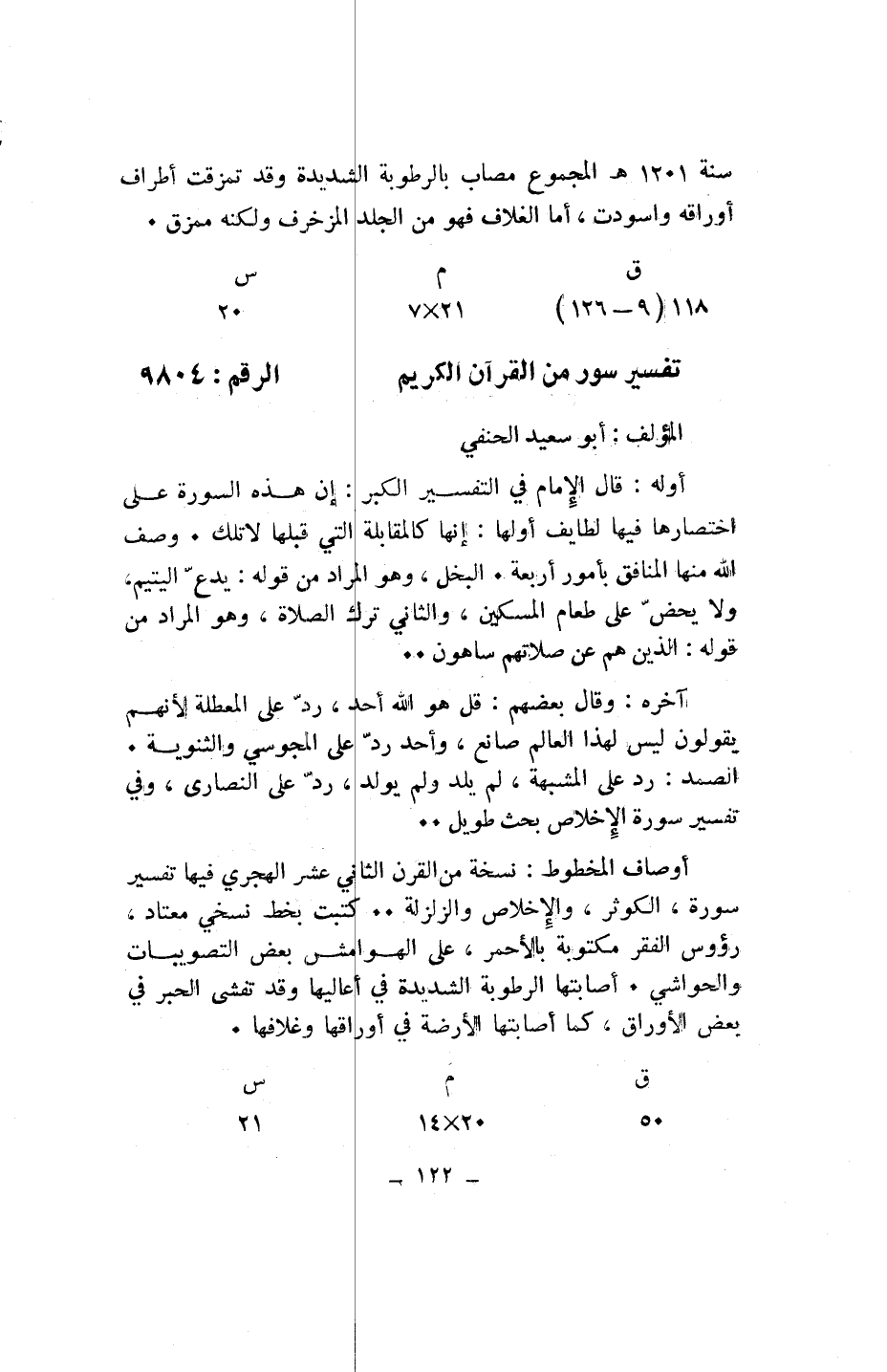 أوصاف المخطوط: نسخة من القرن الثاني عشر الهجري فيها تفسير سورة، الكوثر، والإخلاص والزلزلة .. كتبت بخط نسخي معتاد، رءوس الفقر مكتوبة بالأحمر، على الهوامش بعض التصويبات والحواشي. أصابتها الرطوبة الشديدة في أعاليها وقد تفشى الحبر في بعض الأوراق، كما أصابتها الأرضة في أوراقها وغلافها.