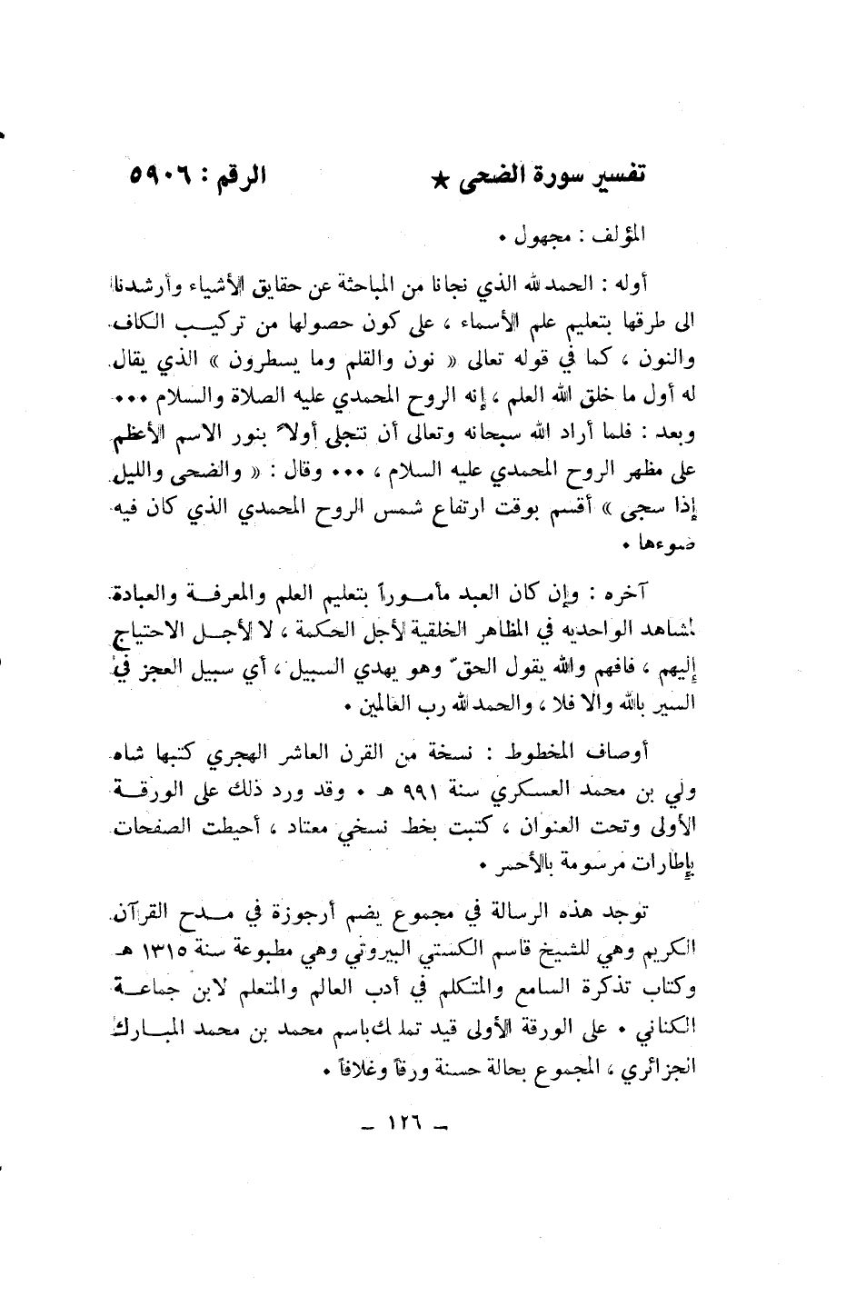 وبعد: فلما أراد الله سبحانه وتعالى أن تتجلى أولا بنور الاسم الأعظم على مظهر الروح المحمدي عليه السلام، ... وقال: «وَالضُّحى وَاللَّيْلِ إِذا سَجى» أقسم بوقت ارتفاع شمس الروح المحمدي الذي كان فيه ضوؤها.