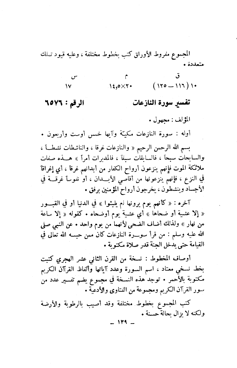 أوله: سورة النازعات مكيّة وآيها خمس أو ست وأربعون.
