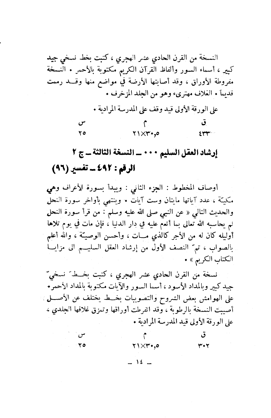 أوصاف المخطوط: الجزء الثاني: ويبدأ بسورة الأعراف وهي مكيّة، عدد آياتها مائتان وست آيات. وينتهي بأواخر سورة النحل والحديث التالي «عن النبي صلى الله عليه وسلم: من قرأ سورة النحل لم يحاسبه الله تعالى بما أنعم عليه في دار الدنيا، فإن مات في يوم تلاها أو ليلة كان له من الأجر كالذي مات، وأحسن الوصيّة، والله أعلم بالصواب، تمّ النصف الأول من إرشاد العقل السليم الى مزايا الكتاب الكريم».