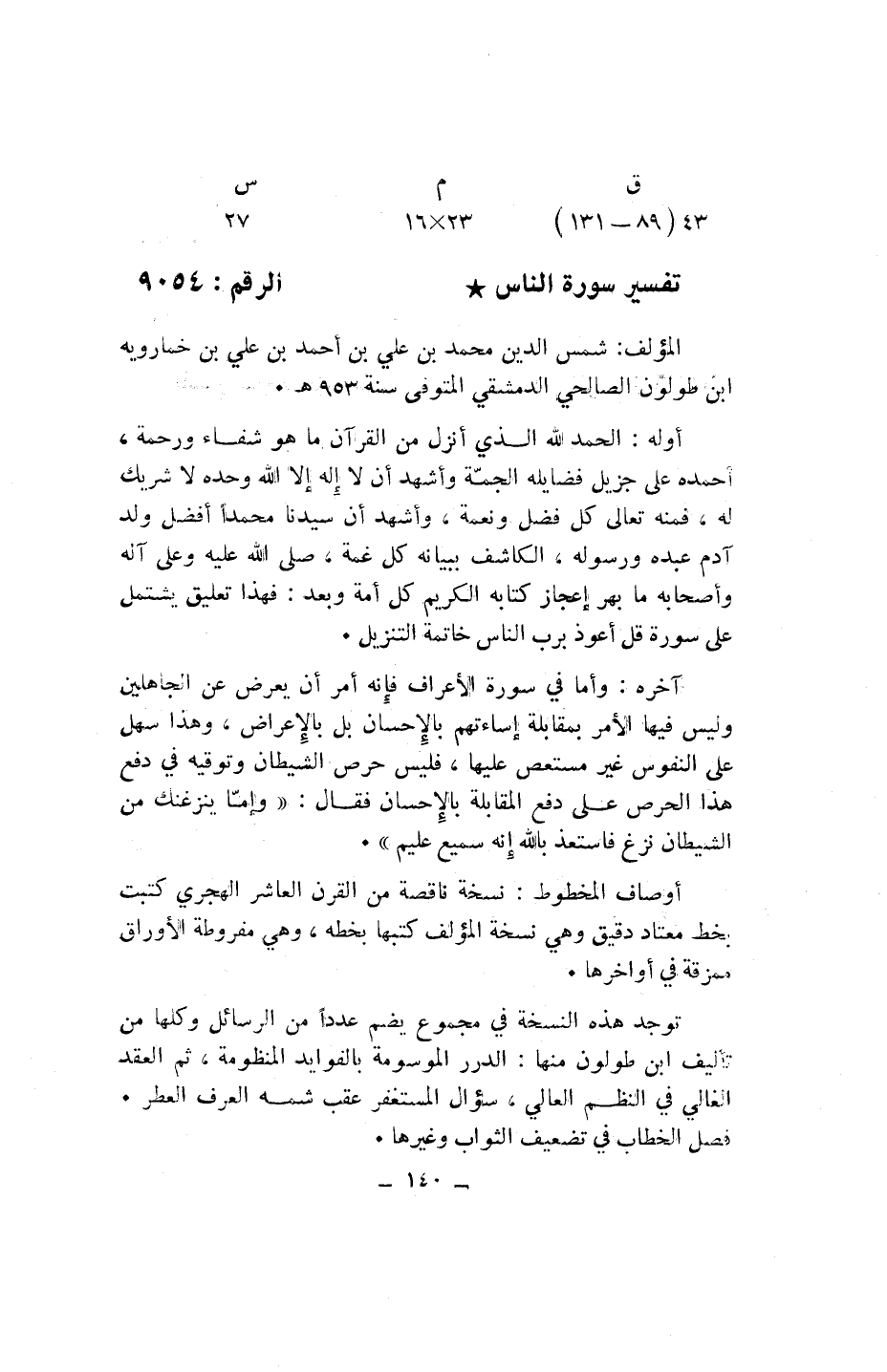 أوصاف المخطوط: نسخة ناقصة من القرن العاشر الهجري كتبت بخط معتاد دقيق وهي نسخة المؤلف كتبها بخطه، وهي مفروطة الأوراق ممزقة في أواخرها.
