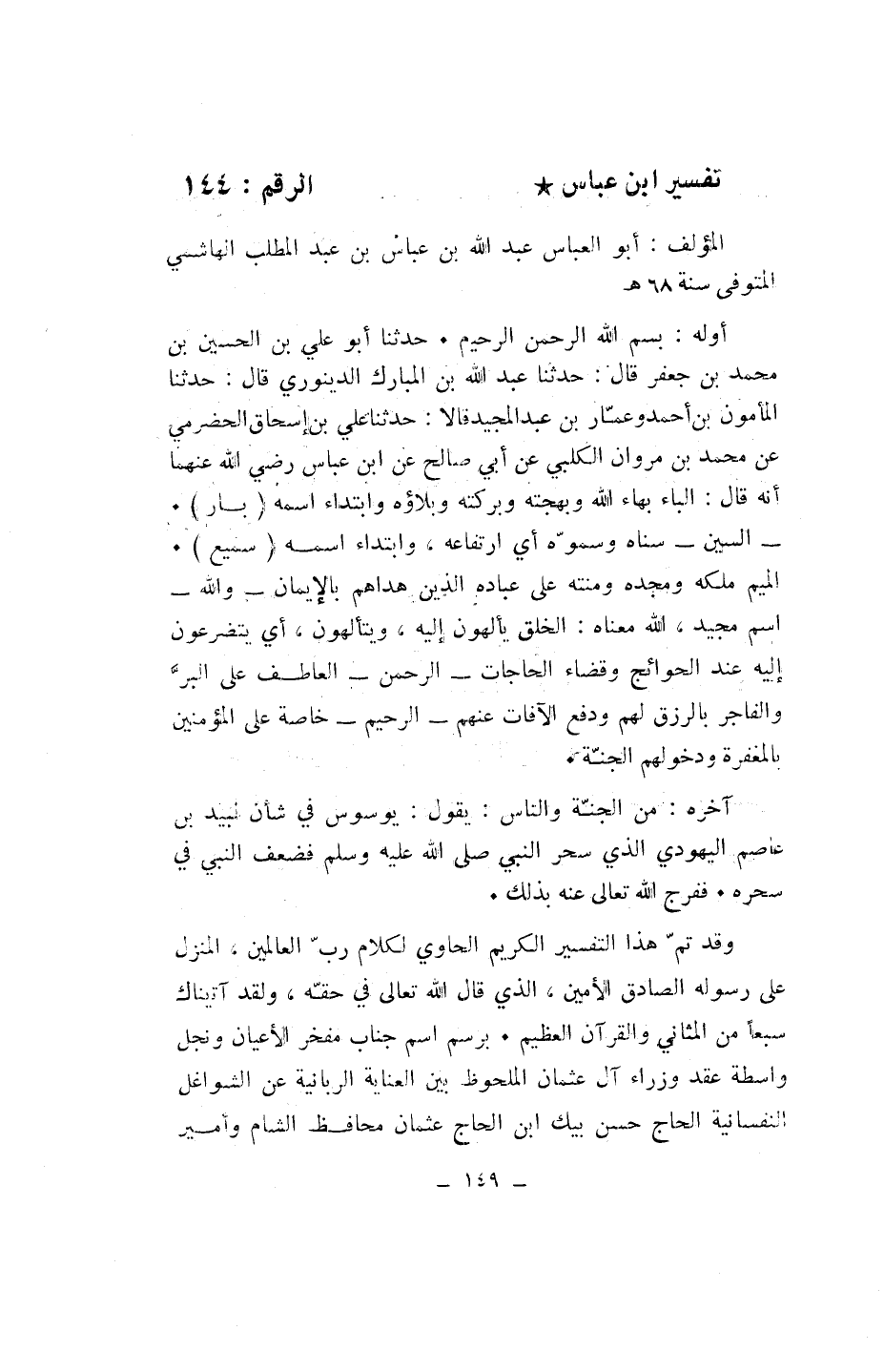 المؤلف: أبو العباس عبد الله بن عباس بن عبد المطلب الهاشمي المتوفى سنة 68 هـ أوله: بسم الله الرحمن الرحيم. حدثنا أبو علي بن الحسين بن محمد بن جعفر قال: حدثنا عبد الله بن المبارك الدينوري قال: حدثنا المأمون بن أحمد وعمّار بن عبد المجيد قالا: حدثنا علي بن إسحاق الحضرمي عن محمد بن مروان الكلبي عن أبي صالح عن ابن عباس رضي الله عنهما أنه قال: الباء بهاء الله وبهجته وبركته وبلاؤه وابتداء اسمه (بار).