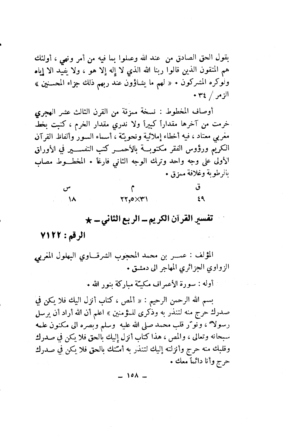 أوله: سورة الأعراف مكيّة مباركة بنور الله.