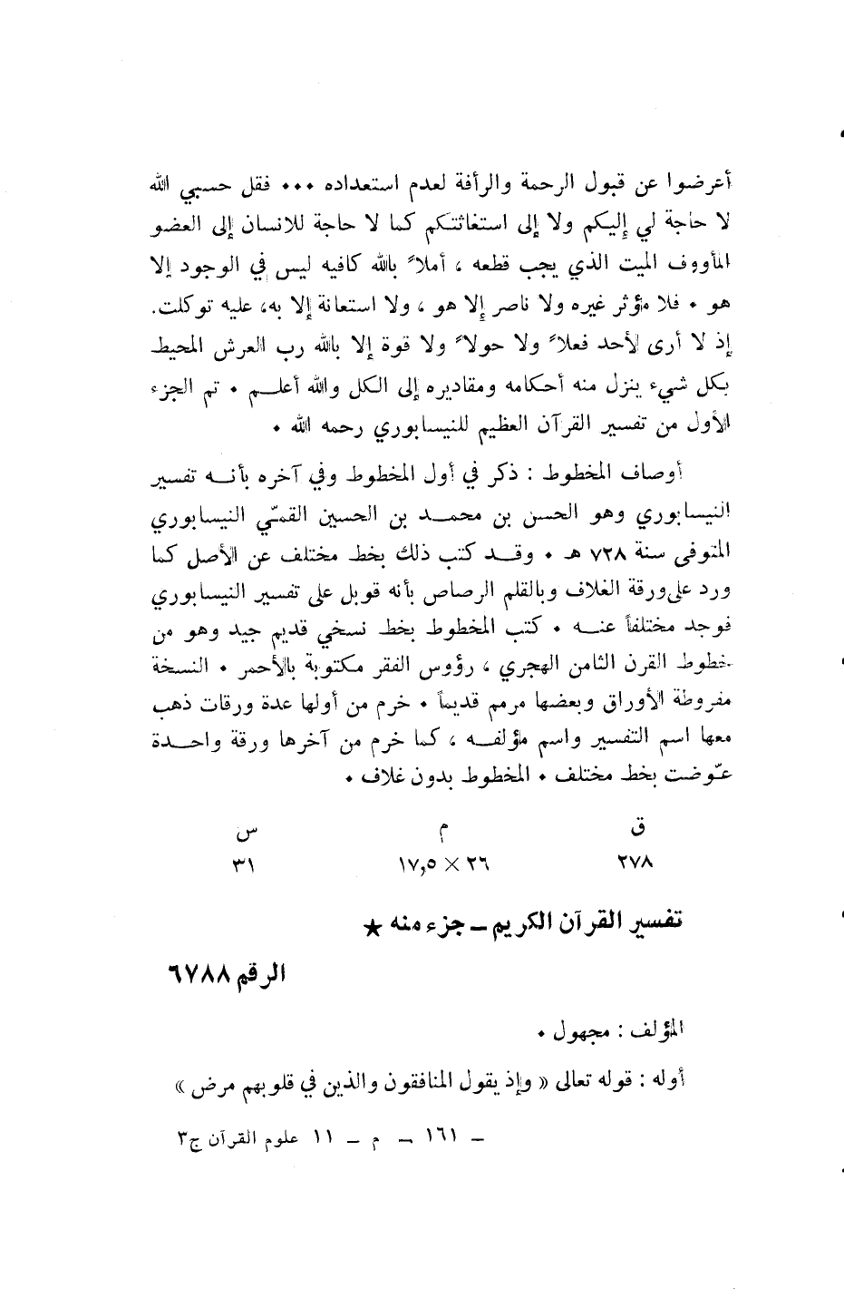 أوصاف المخطوط: ذكر في أول المخطوط وفي آخره بأنه تفسير النيسابوري وهو الحسن بن محمد بن الحسين القمّي النيسابوري المتوفى سنة 728 هـ. وقد كتب ذلك بخط مختلف عن الأصل كما ورد على ورقة الغلاف وبالقلم الرصاص بأنه قوبل على تفسير النيسابوري فوجد مختلفا عنه. كتب المخطوط بخط نسخي قديم جيد وهو من خطوط القرن الثامن الهجري، رءوس الفقر مكتوبة بالأحمر. النسخة مفروطة الأوراق وبعضها مرمم قديما. خرم من أولها عدة ورقات ذهب معها اسم التفسير واسم مؤلفه، كما خرم من آخرها ورقة واحدة عوّضت بخط مختلف. المخطوط بدون غلاف.