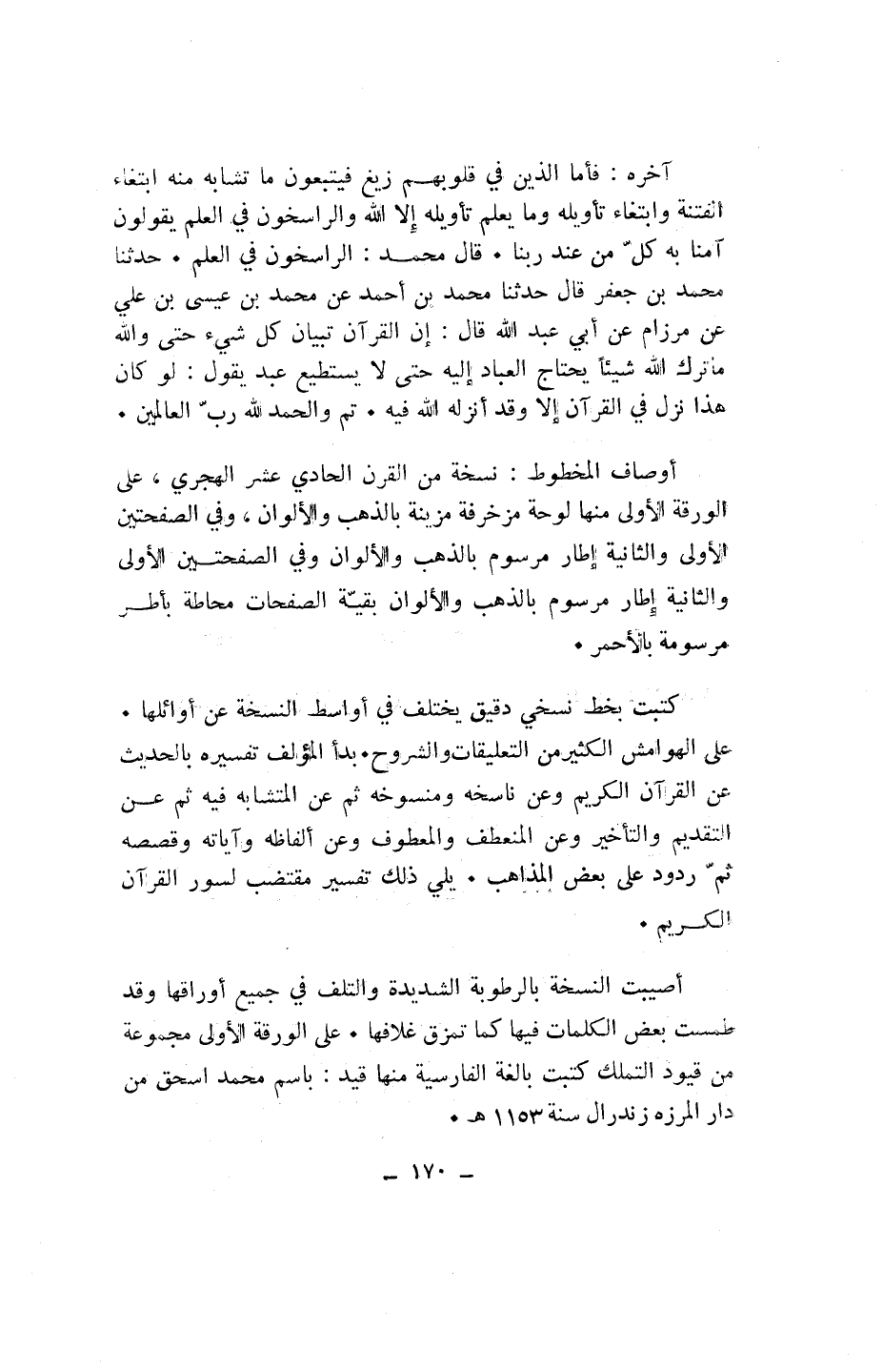 آخره: فأما الذين في قلوبهم زيغ فيتبعون ما تشابه منه ابتغاء الفتنة وابتغاء تأويله وما يعلم تأويله إلا الله والراسخون في العلم يقولون آمنا به كلّ من عند ربنا. قال محمد: الراسخون في العلم. حدثنا محمد بن جعفر قال حدثنا محمد بن أحمد عن محمد بن عيسى بن علي عن مرزام عن أبي عبد الله قال: إن القرآن تبيان كل شيء حتى والله ما ترك الله شيئا يحتاج العباد إليه حتى لا يستطيع عبد يقول: لو كان هذا نزل في القرآن إلا وقد أنزله الله فيه. تم والحمد لله ربّ العالمين.