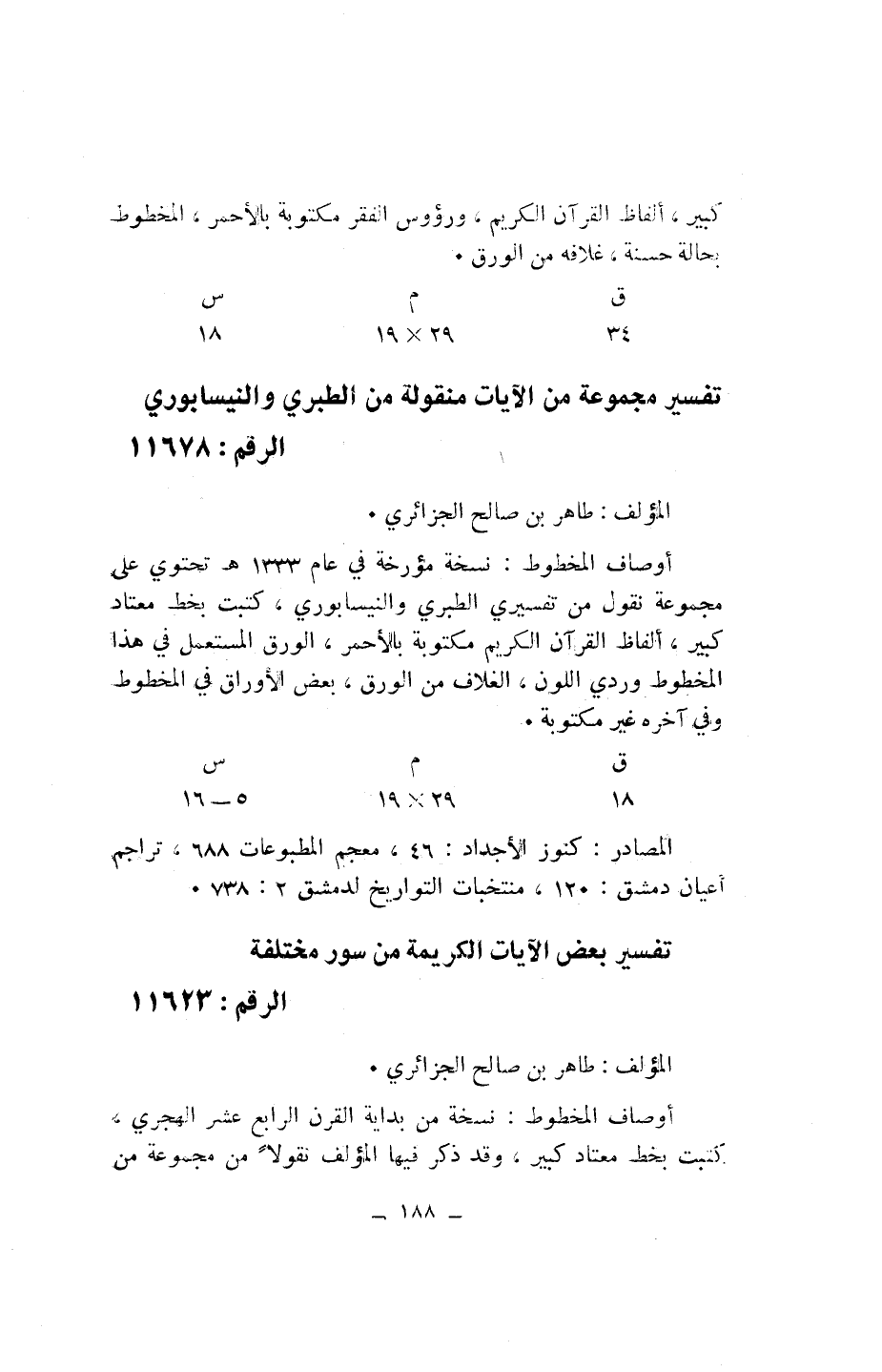 أوصاف المخطوط: نسخة مؤرخة في عام 1333 هـ تحتوي على مجموعة نقول من تفسيري الطبري والنيسابوري، كتبت بخط معتاد كبير، ألفاظ القرآن الكريم مكتوبة بالأحمر، الورق المستعمل في هذا المخطوط وردي اللون، الغلاف من الورق، بعض الأوراق في المخطوط وفي آخره غير مكتوبة.