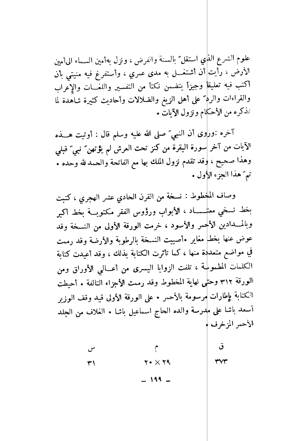 أوصاف المخطوط: نسخة من القرن الحادي عشر الهجري، كتبت بخط نسخي معتاد، الأبواب ورءوس الفقر مكتوبة بخط أكبر وبالمدادين الأحمر والأسود، خرمت الورقة الأولى من النسخة وقد عوض عنها بخط مغاير. أصيبت النسخة بالرطوبة والأرضة وقد رممت في مواضع متعددة منها، كما تأثرت الكتابة بذلك، وقد أعيدت كتابة الكلمات المطموسة، تلفت الزوايا اليسرى من أعالي الأوراق ومن الورقة 312 وحتى نهاية المخطوط وقد رممت الأجزاء التالفة. أحيطت الكتابة بإطارات مرسومة بالأحمر. على الورقة الأولى قيد وقف الوزير أسعد باشا على مدرسة والده الحاج اسماعيل باشا. الغلاف من الجلد الأحمر المزخرف.