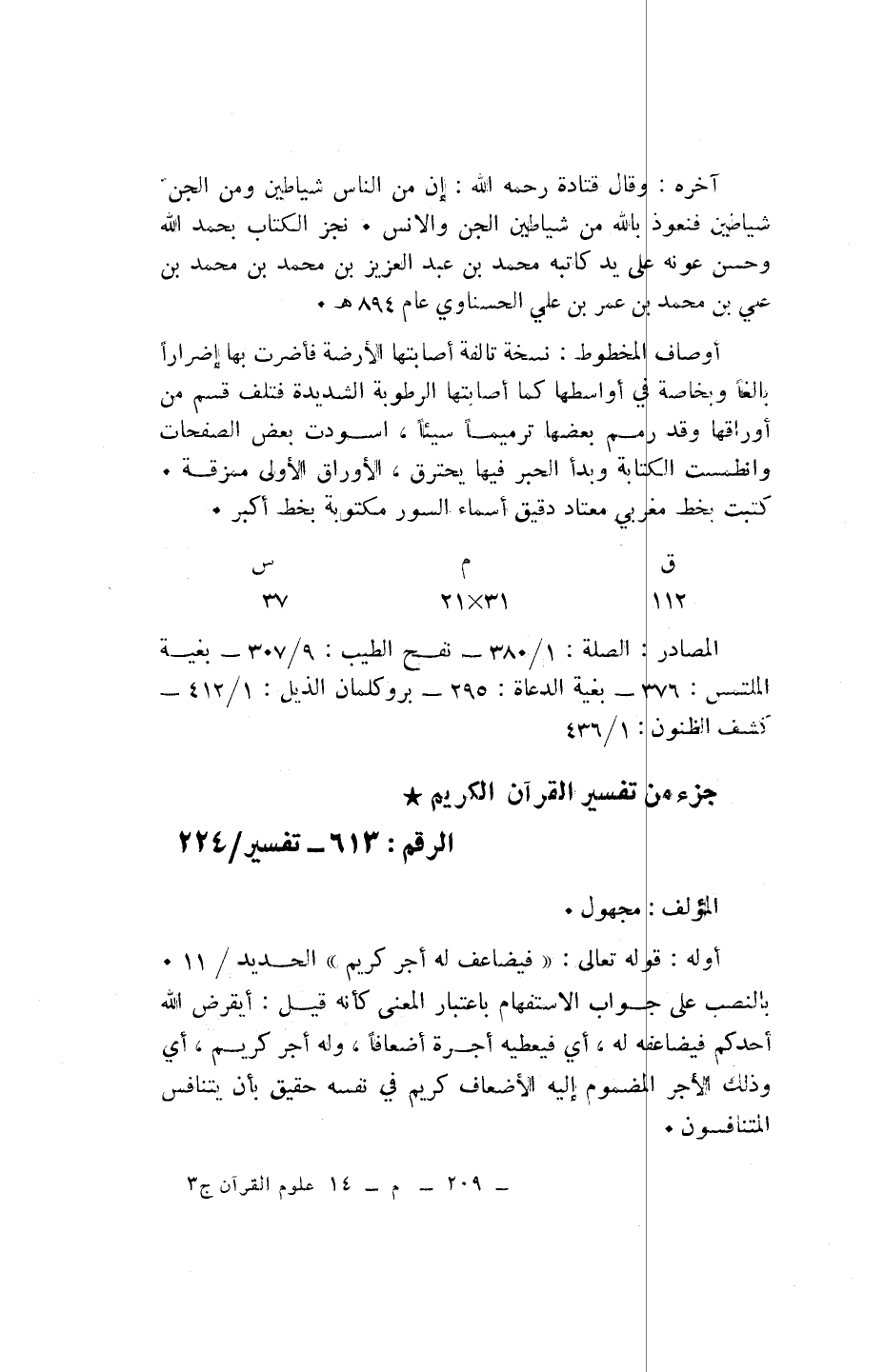آخره: وقال قتادة رحمه الله: إن من الناس شياطين ومن الجنّ شياطين فنعوذ بالله من شياطين الجن والانس. نجز الكتاب بحمد الله وحسن عونه على يد كاتبه محمد بن عبد العزيز بن محمد بن محمد بن علي بن محمد بن عمر بن علي الحسناوي عام 894 هـ.