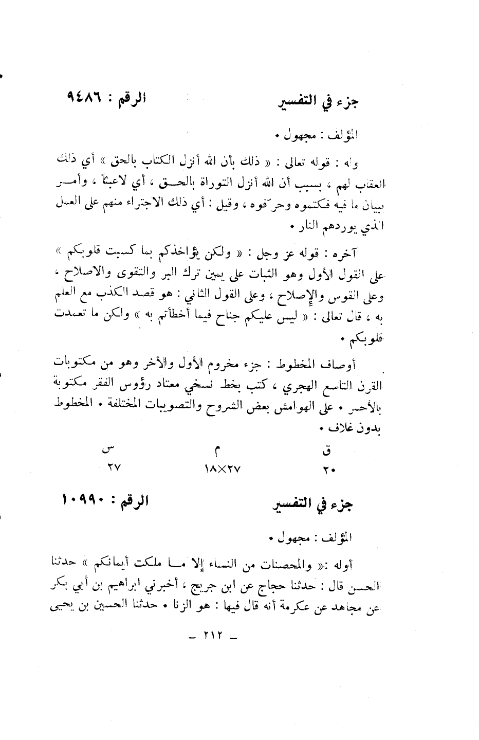 أوصاف المخطوط: جزء مخروم الأول والأخر وهو من مكتوبات القرن التاسع الهجري، كتب بخط نسخي معتاد رءوس الفقر مكتوبة بالأحمر. على الهوامش بعض الشروح والتصويبات المختلفة. المخطوط بدون غلاف.