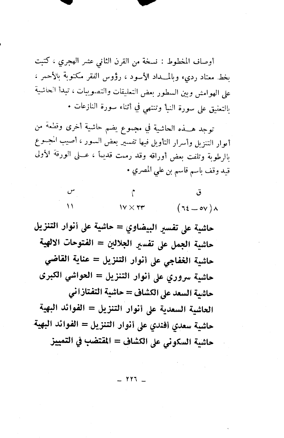 أوصاف المخطوط: نسخة من القرن الثاني عشر الهجري، كتبت بخط معتاد رديء وبالمداد الأسود، رءوس الفقر مكتوبة بالأحمر، على الهوامش وبين السطور بعض التعليقات والتصويبات، تبدأ الحاشية بالتعليق على سورة النبأ وتنتهي في أثناء سورة النازعات.