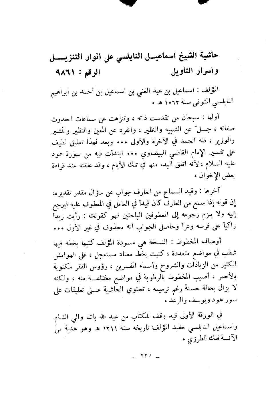 حاشية الشيخ اسماعيل النابلسي على أنوار التنزيل وأسرار التأويل الرقم: 9861 المؤلف: اسماعيل بن عبد الغني بن اسماعيل بن أحمد بن إبراهيم النابلسي المتوفى سنة 1062 هـ.