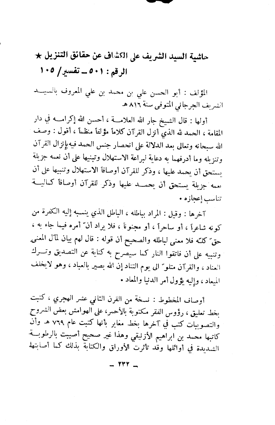 حاشية السيد الشريف على الكشاف عن حقائق التنزيل* الرقم: 501 - تفسير/ 105