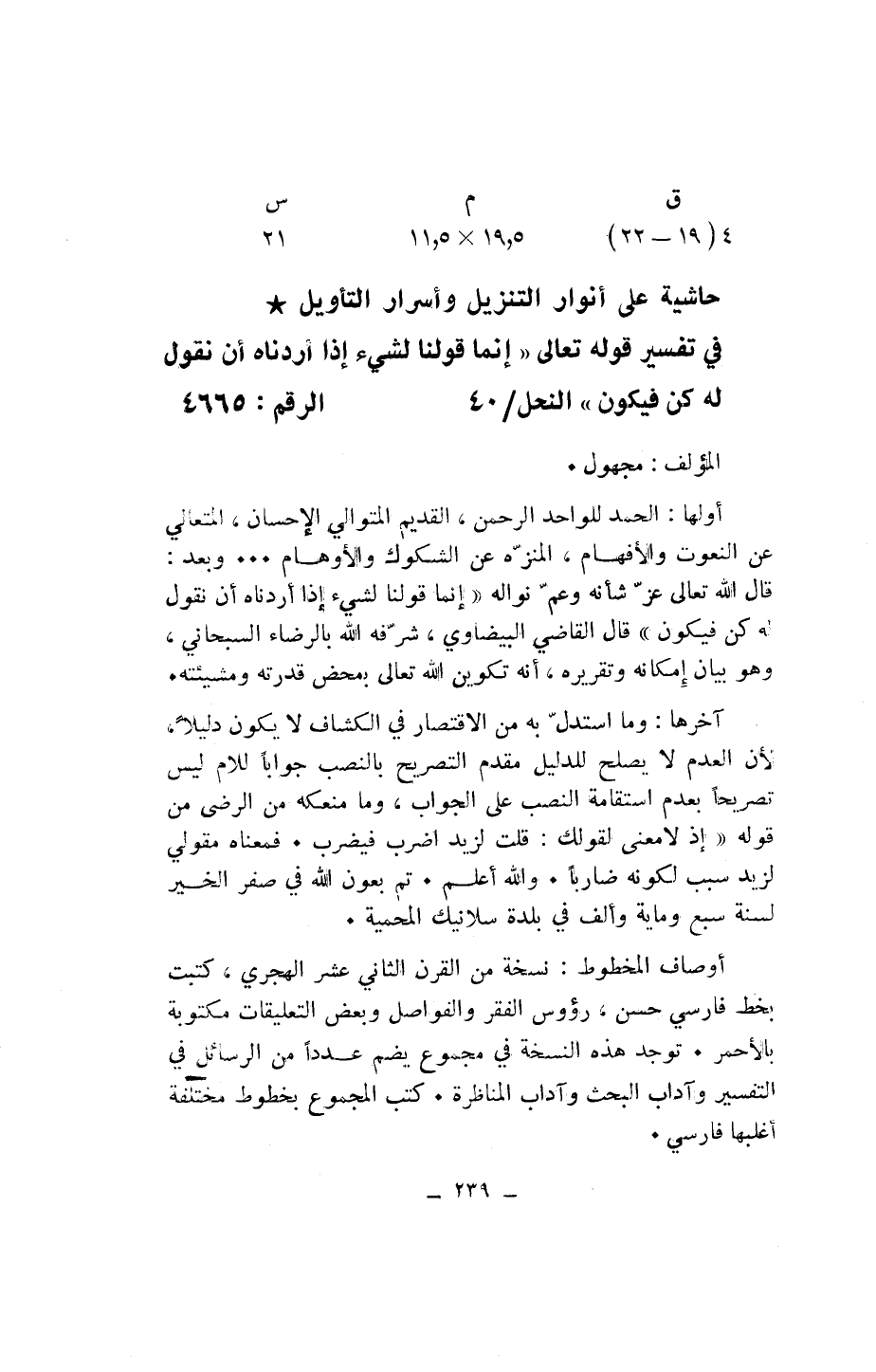 حاشية على أنوار التنزيل وأسرار التأويل* في تفسير قوله تعالى «إِنَّما قَوْلُنا لِشَيْءٍ إِذا أَرَدْناهُ أَنْ نَقُولَ لَهُ كُنْ فَيَكُونُ» النحل/ 40 الرقم: 4665