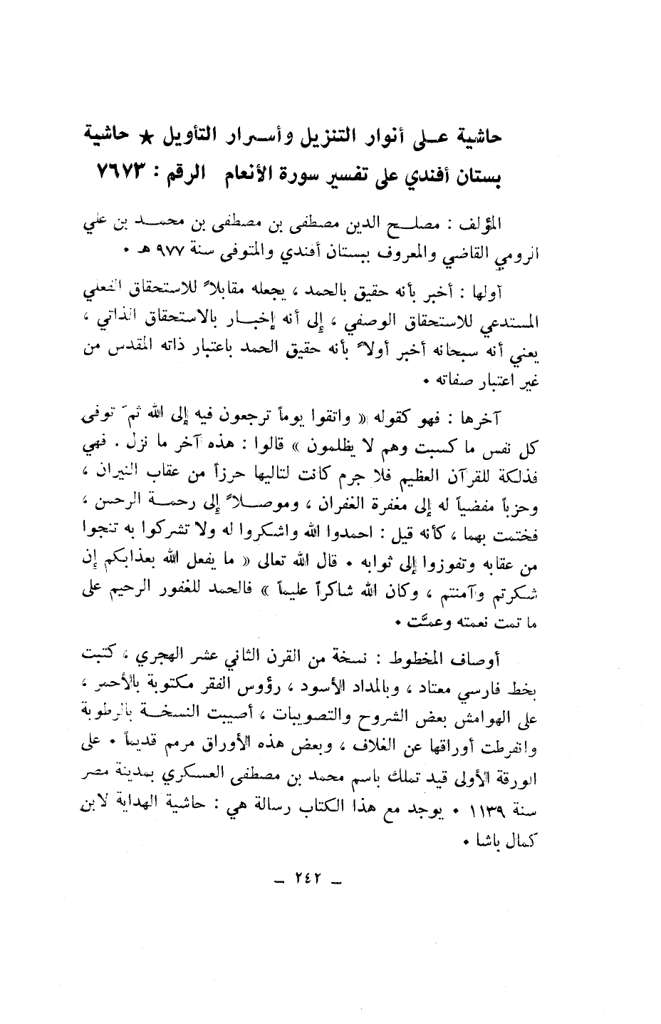 حاشية على أنوار التنزيل وأسرار التأويل* حاشية بستان أفندي على تفسير سورة الأنعام الرقم: 7673