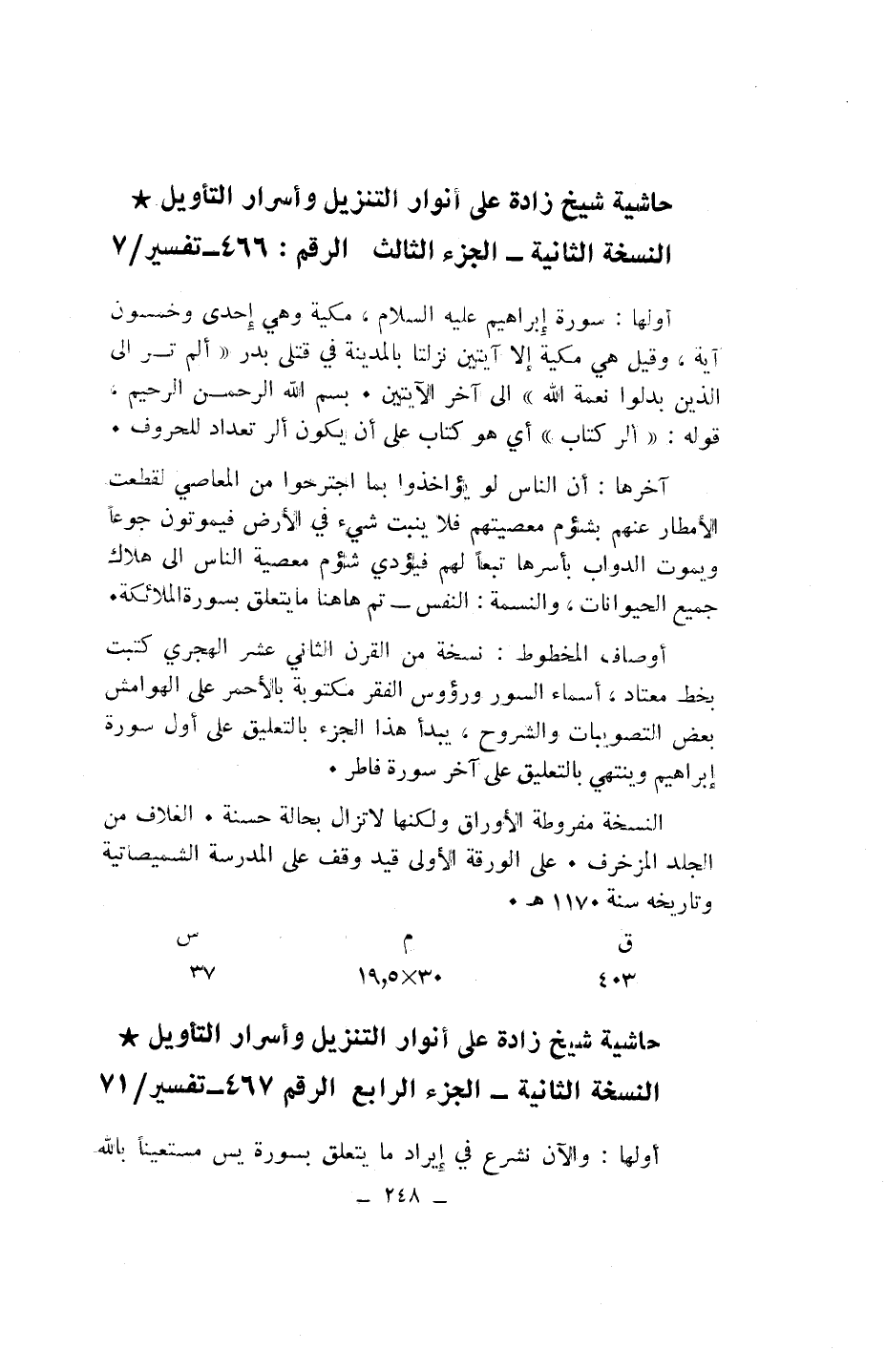 حاشية شيخ زادة على أنوار التنزيل وأسرار التأويل* النسخة الثانية- الجزء الرابع الرقم 467 - تفسير/ 71