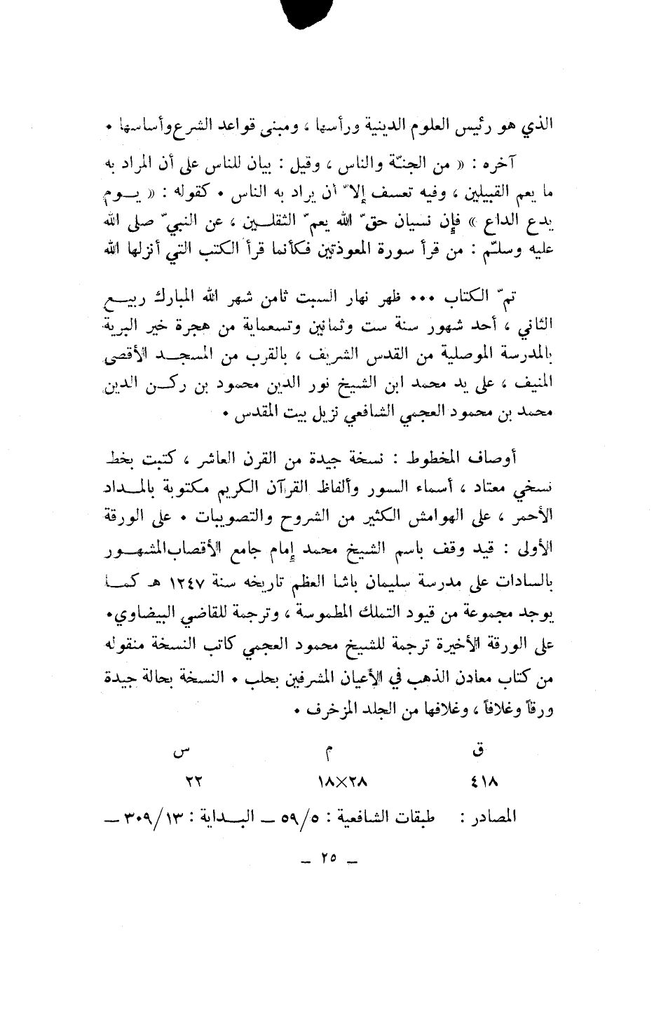 آخره: «مِنَ الْجِنَّةِ وَالنَّاسِ، وقيل: بيان للناس على أن المراد به ما يعم القبيلين، وفيه تعسف إلّا أن يراد به الناس. كقوله: «يَوْمَ يَدْعُ الدَّاعِ» فإن نسيان حقّ الله يعمّ الثقلين، عن النبيّ صلى الله عليه وسلّم: من قرأ سورة المعوذتين فكأنما قرأ الكتب التي أنزلها الله تمّ الكتاب ... ظهر نهار السبت ثامن شهر الله المبارك ربيع الثاني، أحد شهور سنة ست وثمانين وتسعمائة من هجرة خير البرية بالمدرسة الموصلية من القدس الشريف، بالقرب من المسجد الأقصى المنيف، على يد محمد ابن الشيخ نور الدين محمود بن ركن الدين محمد بن محمود العجمي الشافعي نزيل بيت المقدس.
