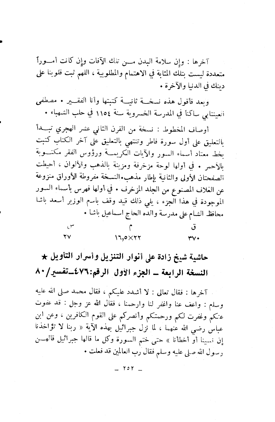 حاشية شيخ زادة على أنوار التنزيل وأسرار التأويل النسخة الرابعة- الجزء الأول الرقم: 476 - تفسير/ 80