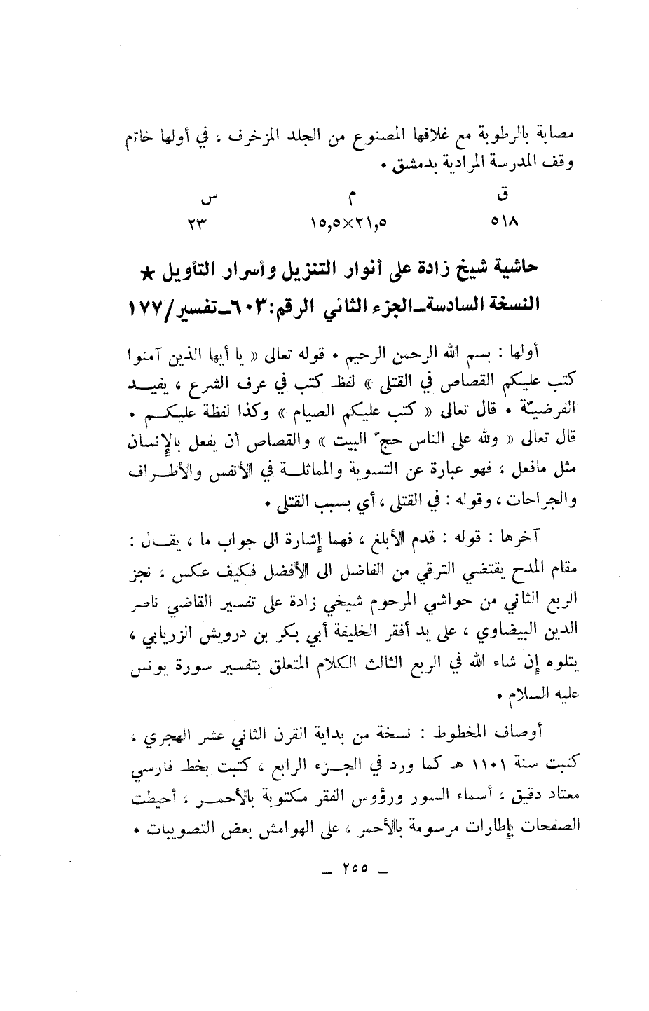 حاشية شيخ زادة على أنوار التنزيل وأسرار التأويل* النسخة السادسة- الجزء الثاني الرقم: 603 - تفسير/ 177