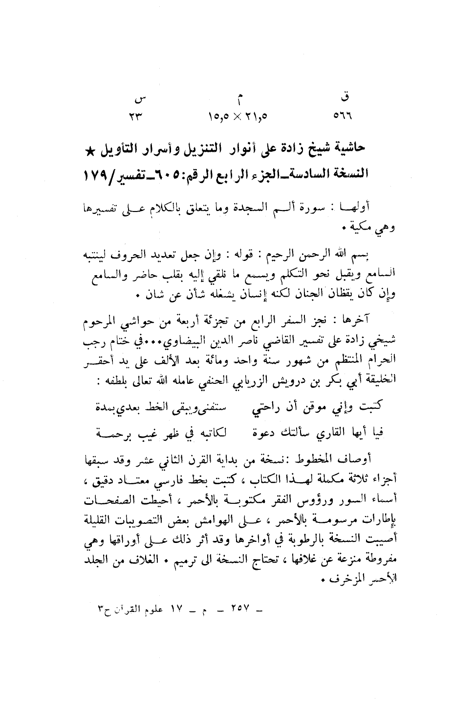 حاشية شيخ زادة على أنوار التنزيل وأسرار التأويل* النسخة السادسة- الجزء الرابع الرقم: 605 - تفسير/ 179