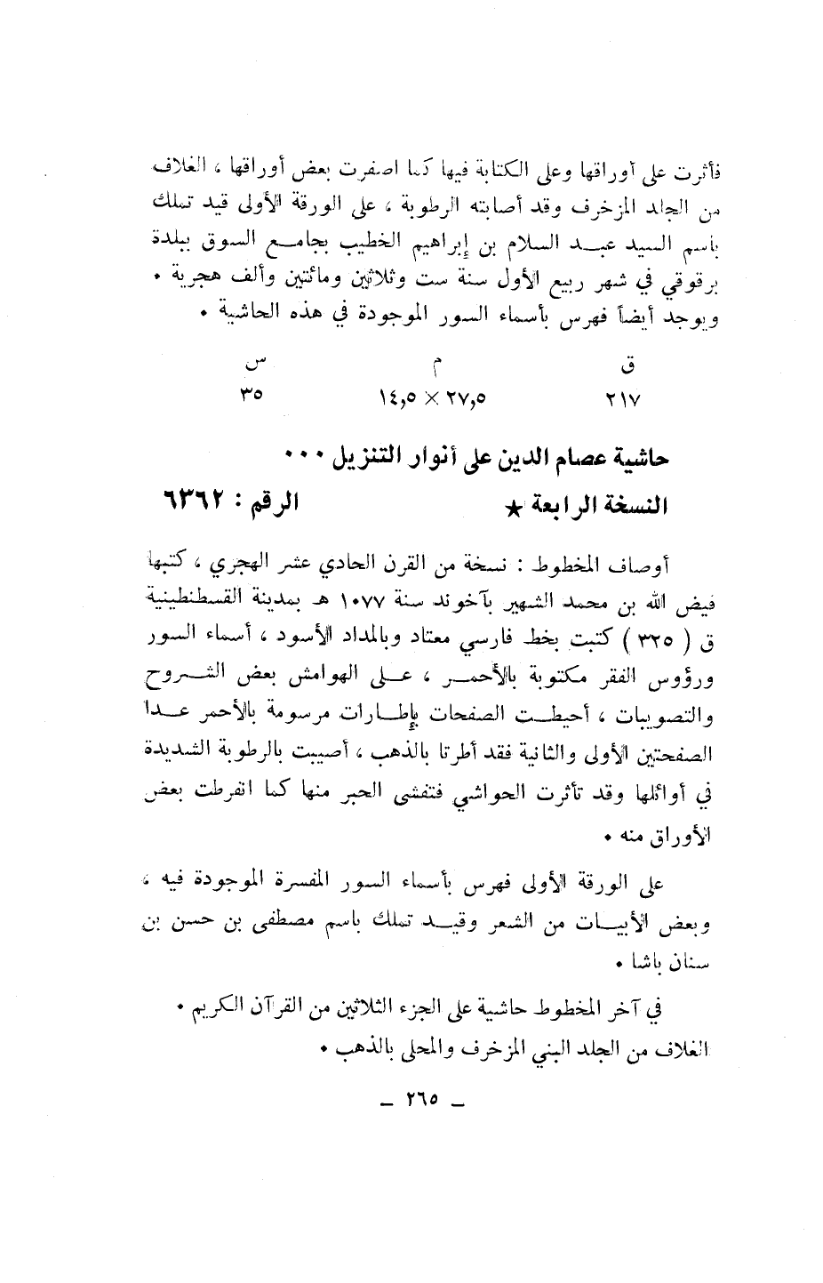 أوصاف المخطوط: نسخة من القرن الحادي عشر الهجري، كتبها فيض الله بن محمد الشهير بآخوند سنة 1077 هـ بمدينة القسطنطينية ق (325) كتبت بخط فارسي معتاد وبالمداد الأسود، أسماء السور ورءوس الفقر مكتوبة بالأحمر، على الهوامش بعض الشروح والتصويبات، أحيطت الصفحات بإطارات مرسومة بالأحمر عدا الصفحتين الأولى والثانية فقد أطرتا بالذهب، أصيبت بالرطوبة الشديدة في أوائلها وقد تأثرت الحواشي فتفشى الحبر منها كما انفرطت بعض الأوراق منه.