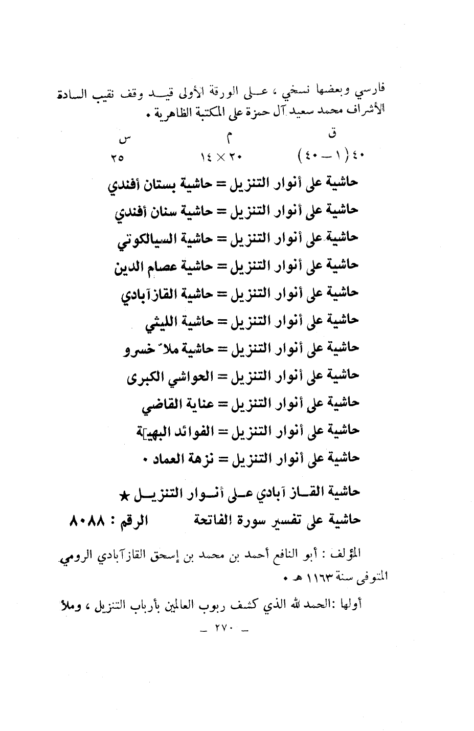 حاشية القازآبادي على أنوار التنزيل* حاشية على تفسير سورة الفاتحة الرقم: 8088 المؤلف: أبو النافع أحمد بن محمد بن إسحاق القازآبادي الرومي المتوفى سنة 1163 هـ.
