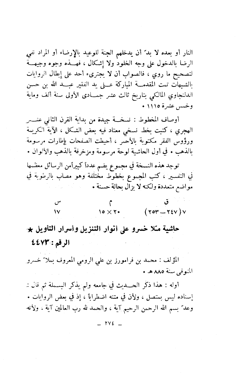 حاشية ملّا خسرو على أنوار التنزيل وأسرار التأويل* الرقم: 4473