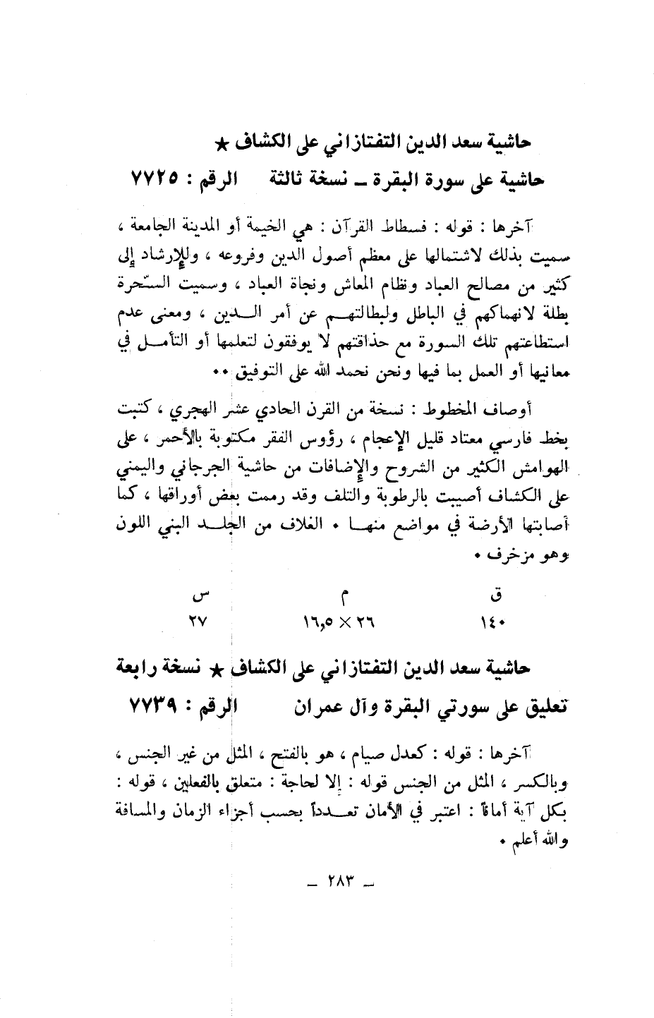 حاشية سعد الدين التفتازاني على الكشاف* نسخة رابعة تعليق على سورتي البقرة وآل عمران الرقم: 7739
