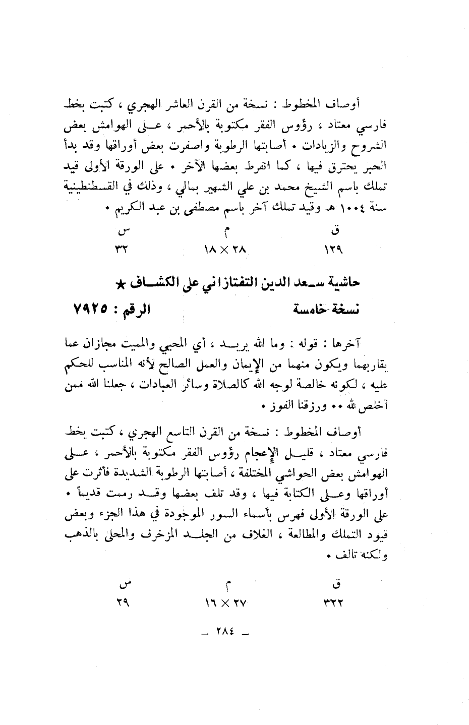 حاشية سعد الدين التفتازاني على الكشاف* نسخة خامسة الرقم: 7925