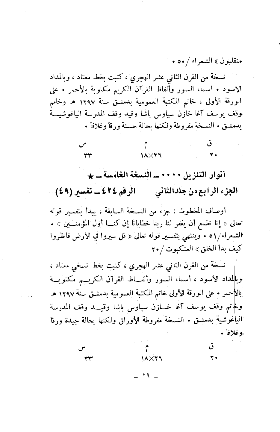 الشعراء/ 51. وينتهي بتفسير قوله تعالى «قُلْ سِيرُوا فِي الْأَرْضِ فَانْظُرُوا كَيْفَ بَدَأَ الْخَلْقَ» العنكبوت/ 20 نسخة من القرن الثاني عشر الهجري، كتبت بخط نسخي معتاد، وبالمداد الأسود، أسماء السور وألفاظ القرآن الكريم مكتوبة بالأحمر. على الورقة الأولى خاتم المكتبة العمومية بدمشق سنة 1297 هـ وخاتم وقف يوسف آغا خازن سياوس باشا وقيد وقف المدرسة الياغوشية بدمشق. النسخة مفروطة الأوراق ولكنها بحالة جيدة ورقا وغلافا.