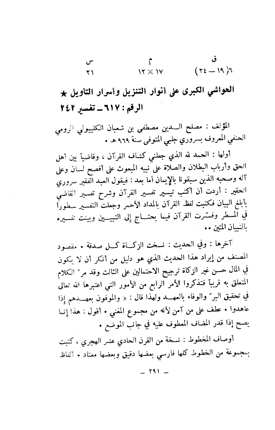 الحواشي الكبرى على أنوار التنزيل وأسرار التأويل* الرقم: 617 - تفسير 242