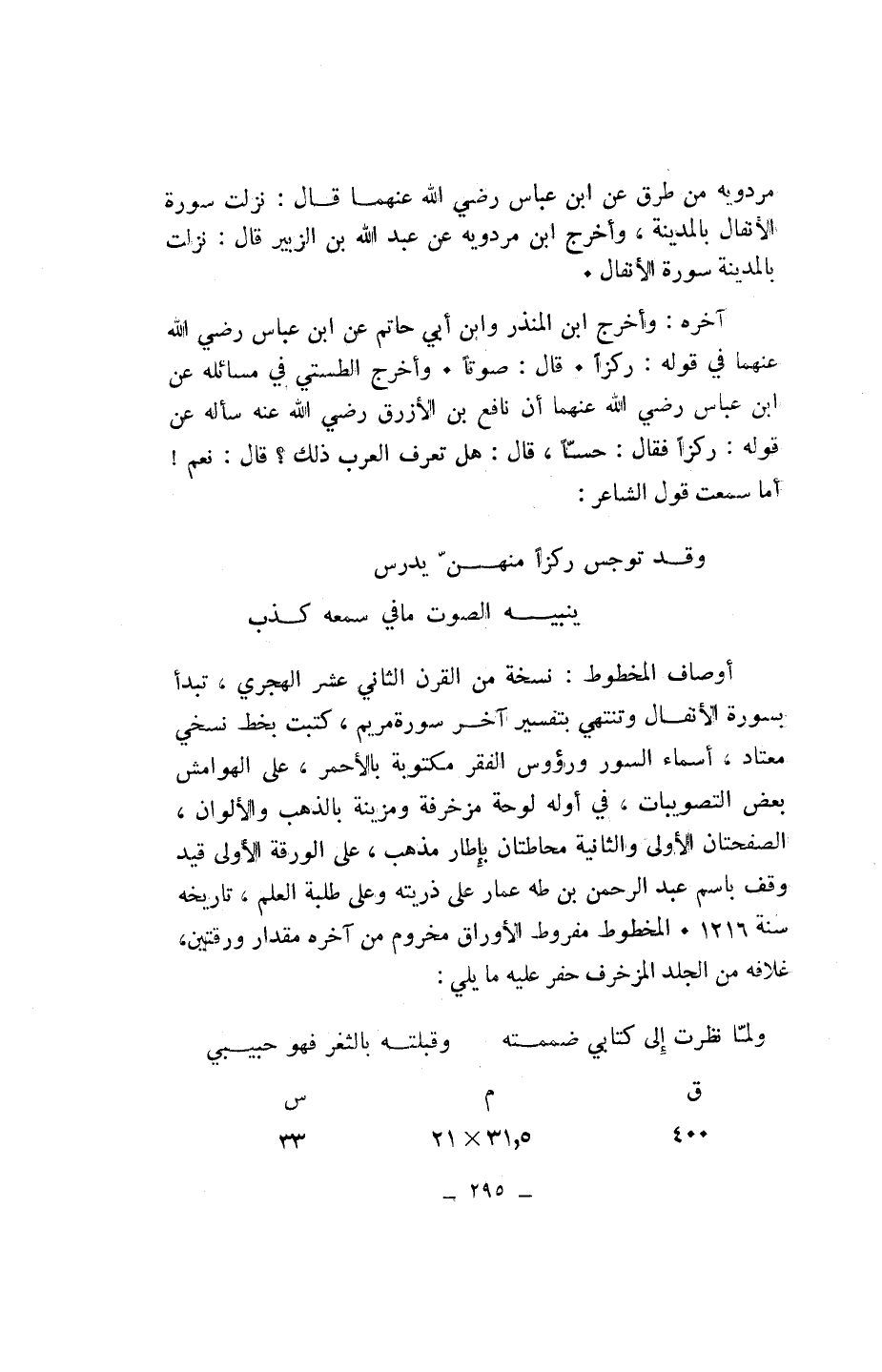 وقد توجس ركزا منهنّ يدرس* ينبيه الصوت ما في سمعه كذب أوصاف المخطوط: نسخة من القرن الثاني عشر الهجري، تبدأ بسورة الأنفال وتنتهي بتفسير آخر سورة مريم، كتبت بخط نسخي معتاد، أسماء السور ورءوس الفقر مكتوبة بالأحمر، على الهوامش بعض التصويبات، في أوله لوحة مزخرفة ومزينة بالذهب والألوان، الصفحتان الأولى والثانية محاطتان بإطار مذهب، على الورقة الأولى قيد وقف باسم عبد الرحمن بن طه عمار على ذريته وعلى طلبة العلم، تاريخه سنة 1216. المخطوط مفروط الأوراق مخروم من آخره مقدرا ورقتين، غلافه من الجلد المزخرف حفر عليه ما يلي: