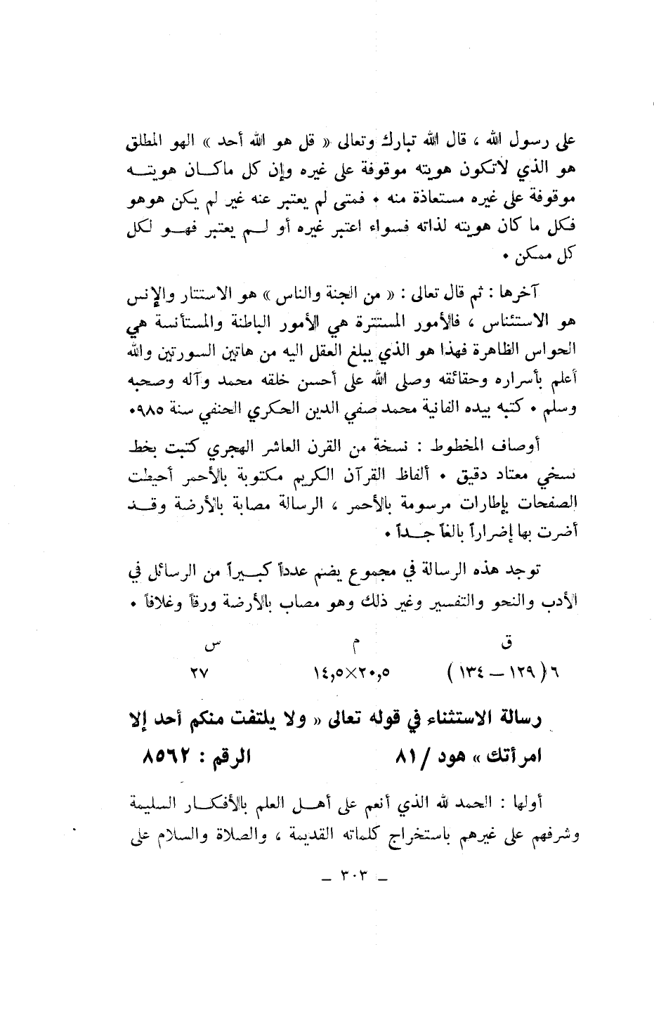 أوصاف المخطوط: نسخة من القرن العاشر الهجري كتبت بخط نسخي معتاد دقيق. ألفاظ القرآن الكريم مكتوبة بالأحمر أحيطت الصفحات بإطارات مرسومة بالأحمر، الرسالة مصابة بالأرضة وقد أضرت بها إضرارا بالغا جدا.