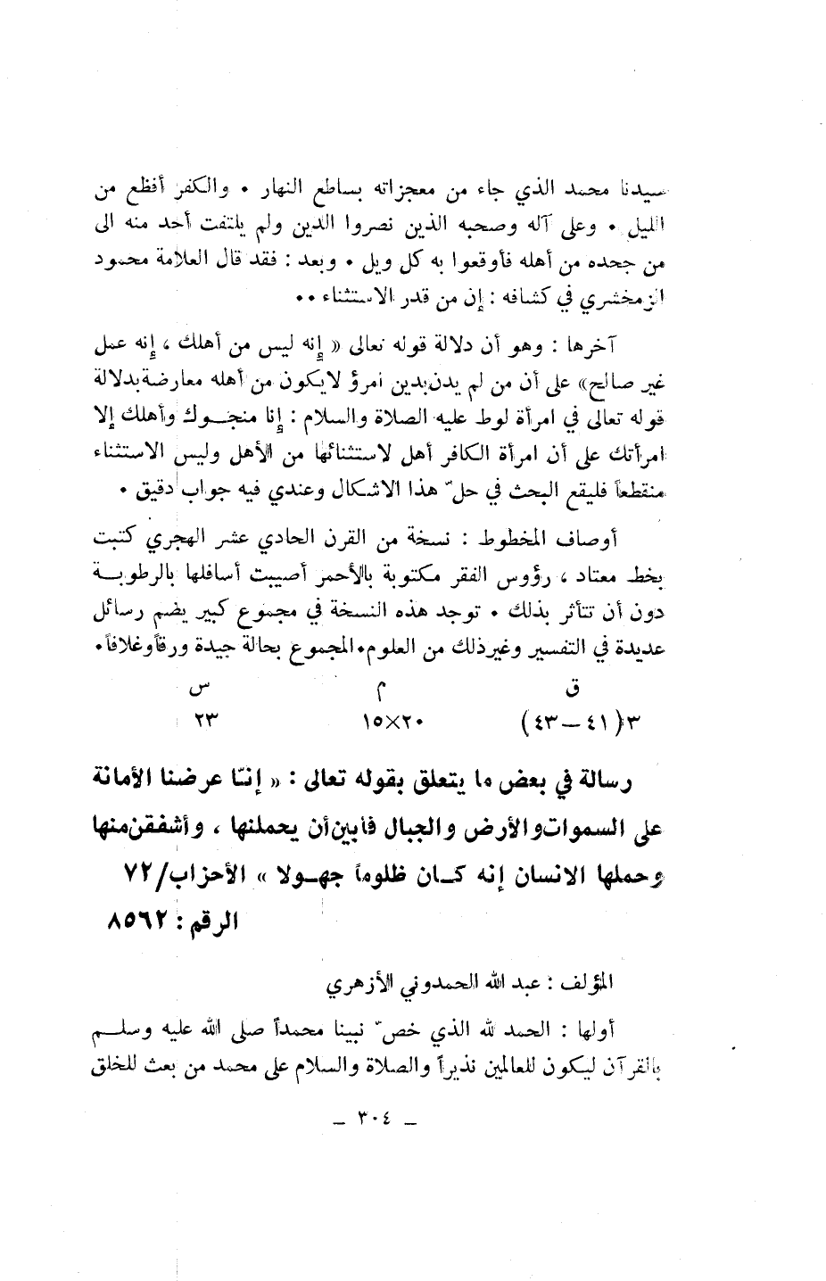 رسالة في بعض ما يتعلق بقوله تعالى: «إِنَّا عَرَضْنَا الْأَمانَةَ عَلَى السَّماواتِ وَالْأَرْضِ وَالْجِبالِ فَأَبَيْنَ أَنْ يَحْمِلْنَها، وَأَشْفَقْنَ مِنْها وَحَمَلَهَا الْإِنْسانُ إِنَّهُ كانَ ظَلُوماً جَهُولًا» الأحزاب/ 72 الرقم: 8562
