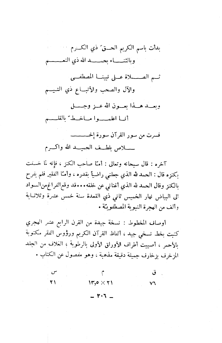 بدأت باسم الكريم الحقّ ذي الكرم* وبالثناء بحمد الله ذي النعم ثم الصلاة على نبينا المصطفى* والآل والصحب والأتباع ذي الشيم وبعد هذا بعون الله عز وجل* أنا اعلموا ما خطّ بالقلم فسرت من سور القرآن سورة إخلاص* بلطف الحميد الله واكرم آخره: قال سبحانه وتعالى: أمّا صاحب الكنز، فإنه لما خسفت بكنزه قال: الحمد الله الذي جعلني راضيا بقدره، وأمّا الفقير فلم يفرح بالكنز وقال الحمد الله الذي أغناني عن خلقه ... قد وقع الفراغ من السواد الى البياض نهار الخميس ثاني ذي القعدة سنة خمس عشرة وثلاثمائة وألف من الهجرة النبوية المصطفويّة.