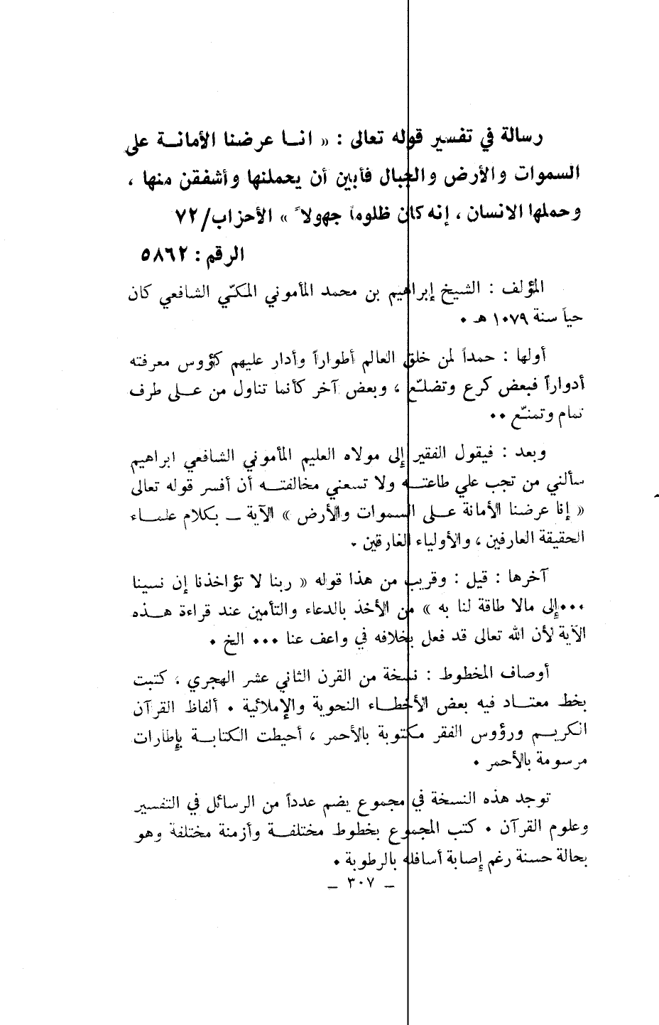رسالة في تفسير قوله تعالى: «إِنَّا عَرَضْنَا الْأَمانَةَ عَلَى السَّماواتِ وَالْأَرْضِ وَالْجِبالِ فَأَبَيْنَ أَنْ يَحْمِلْنَها وَأَشْفَقْنَ مِنْها، وَحَمَلَهَا الْإِنْسانُ، إِنَّهُ كانَ ظَلُوماً جَهُولًا» الأحزاب/ 72 الرقم: 5862