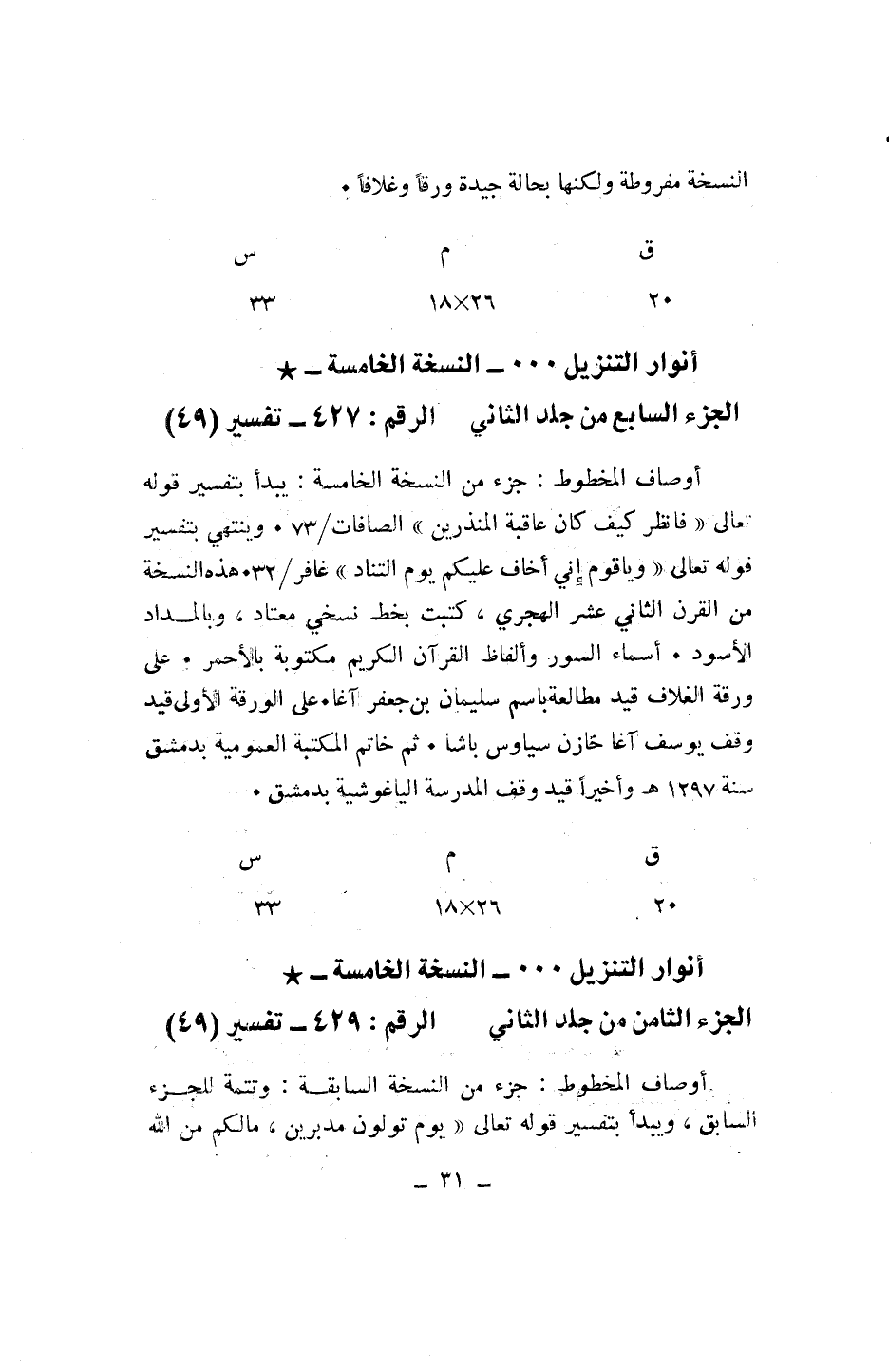 أوصاف المخطوط: جزء من النسخة الخامسة: يبدأ بتفسير قوله تعالى «فَانْظُرْ كَيْفَ كانَ عاقِبَةُ الْمُنْذَرِينَ» الصافات/ 73. وينتهي بتفسير قوله تعالى «وَيا قَوْمِ إِنِّي أَخافُ عَلَيْكُمْ يَوْمَ التَّنادِ» غافر/ 32. هذه النسخة من القرن الثاني عشر الهجري، كتبت بخط نسخي معتاد، وبالمداد الأسود. أسماء السور وألفاظ القرآن الكريم مكتوبة بالأحمر. على ورقة الغلاف قيد مطالعة باسم سليمان بن جعفر آغا. على الورقة الأولى قيد وقف يوسف آغا خازن سياوس باشا. ثم خاتم المكتبة العمومية بدمشق سنة 1297 هـ وأخيرا قيد وقف المدرسة الياغوشية بدمشق.