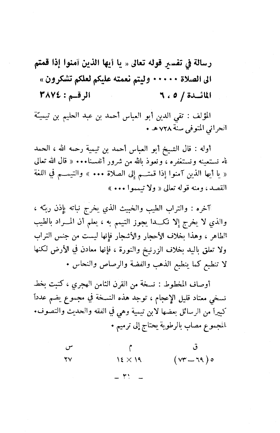 رسالة في تفسير قوله تعالى «يا أَيُّهَا الَّذِينَ آمَنُوا إِذا قُمْتُمْ إِلَى الصَّلاةِ ..... وَلِيُتِمَّ نِعْمَتَهُ عَلَيْكُمْ لَعَلَّكُمْ تَشْكُرُونَ» المائدة/ 5، 6 الرقم: 3874