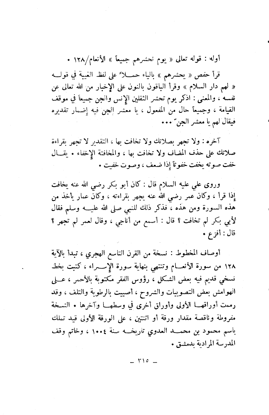 أوصاف المخطوط: نسخة من القرن التاسع الهجري، تبدأ بالآية 128 من سورة الأنعام وتنتهي بنهاية سورة الإسراء، كتبت بخط نسخي قديم فيه بعض الشكل، رءوس الفقر مكتوبة بالأحمر، على الهوامش بعض التصويبات والشروح، أصيبت بالرطوبة والتلف، وقد رممت أوراقها الأولى وأوراق أخرى في وسطها وآخرها. النسخة مفروطة وناقصة مقدار ورقة أو اثنتين، على الورقة الأولى قيد تملك باسم محمود بن محمد العدوي تاريخه سنة 1004، وخاتم وقف المدرسة المرادية بدمشق.