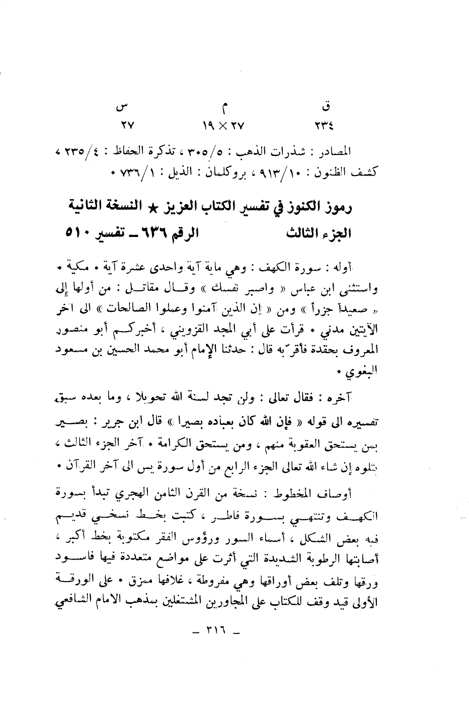 أوصاف المخطوط: نسخة من القرن الثامن الهجري تبدأ بسورة الكهف وتنتهي بسورة فاطر، كتبت بخط نسخي قديم فيه بعض الشكل، أسماء السور ورءوس الفقر مكتوبة بخط أكبر، أصابتها الرطوبة الشديدة التي أثرت على مواضع متعددة فيها فاسود ورقها وتلف بعض أوراقها وهي مفروطة، غلافها ممزق. على الورقة الأولى قيد وقف للكتاب على المجاورين المشتغلين بمذهب الامام الشافعي
