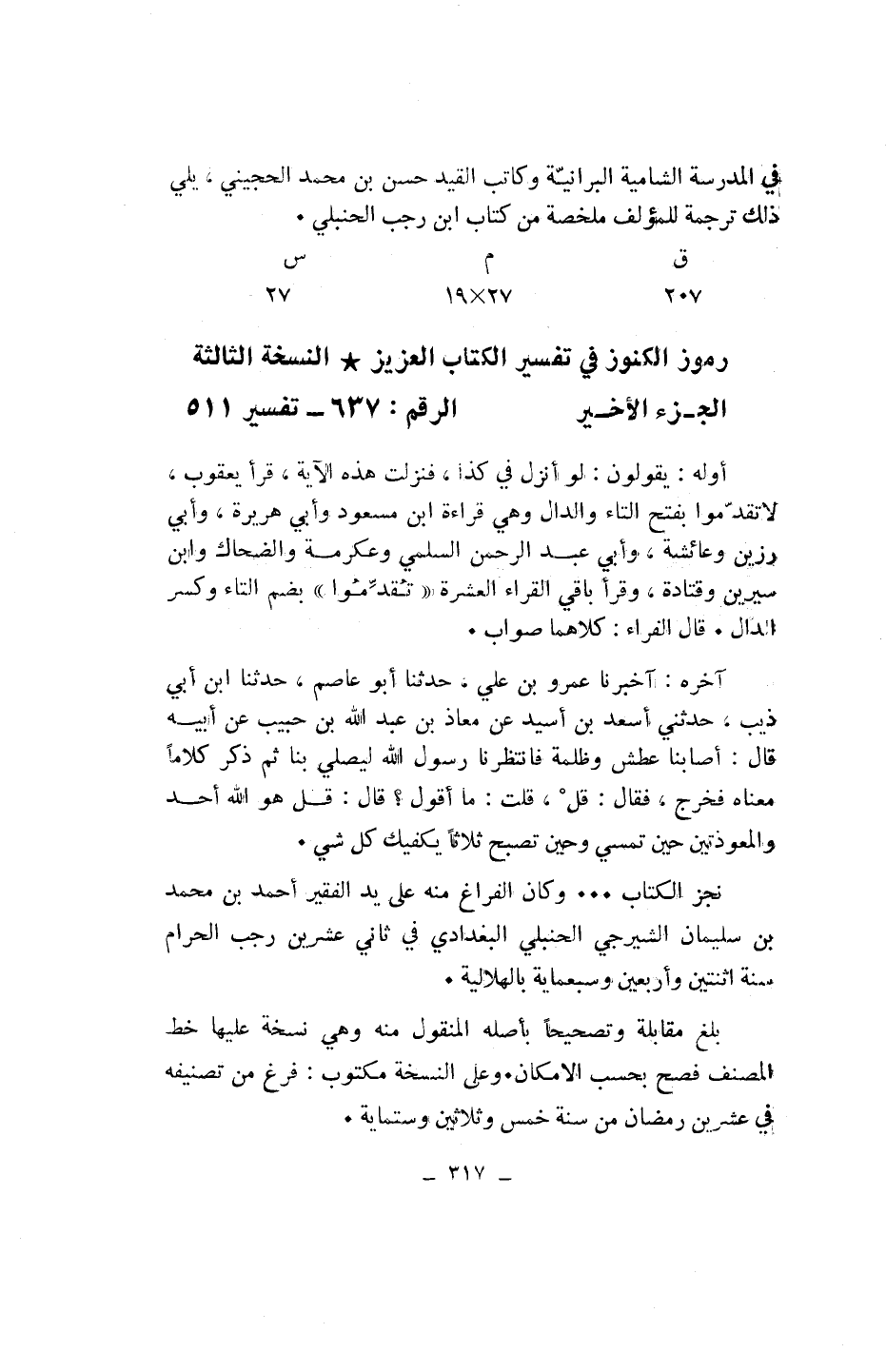 رموز الكنوز في تفسير الكتاب العزيز* النسخة الثالثة الجزء الأخير الرقم: 637 - تفسير 511