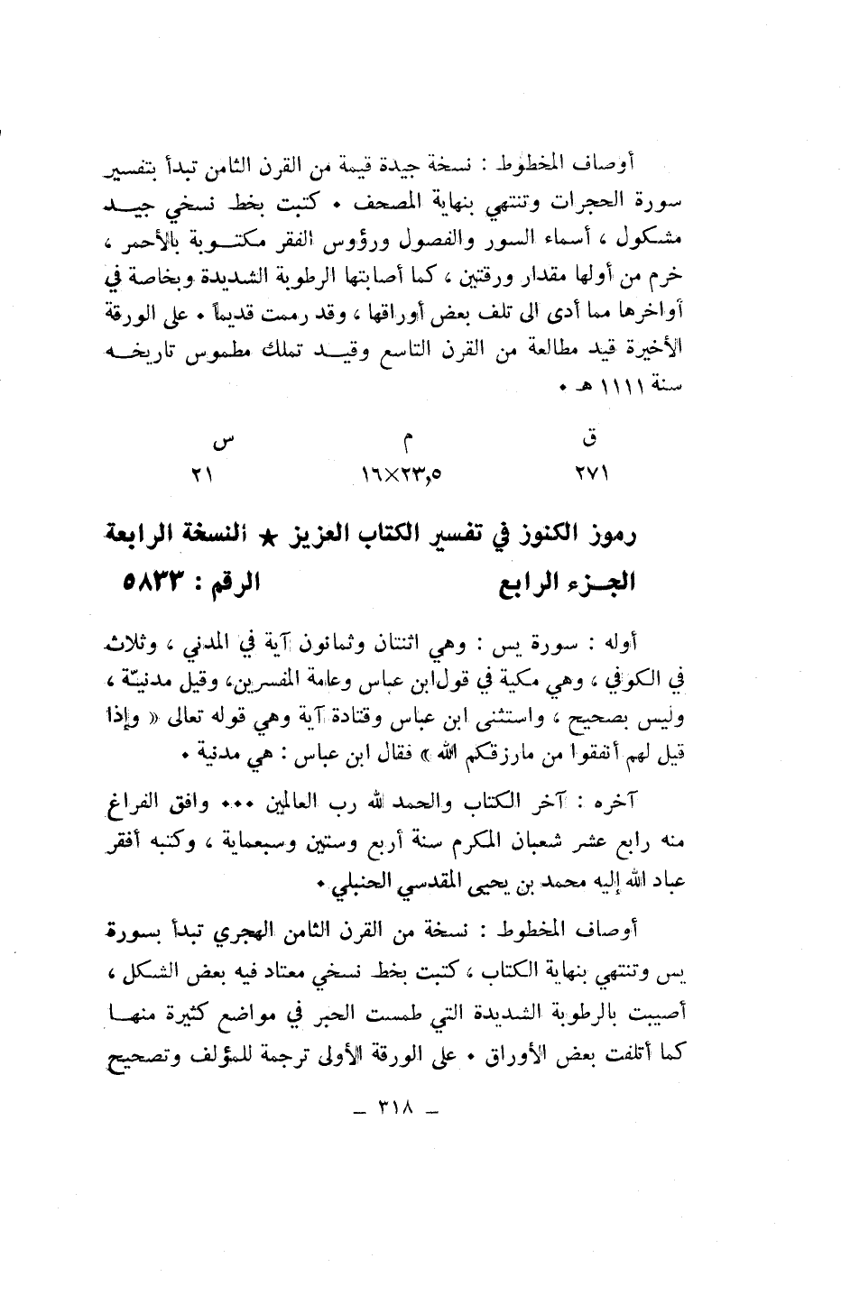 أوصاف المخطوط: نسخة جيدة قيمة من القرن الثامن تبدأ بتفسير سورة الحجرات وتنتهي بنهاية المصحف. كتبت بخط نسخي جيد مشكول، أسماء السور والفصول ورءوس الفقر مكتوبة بالأحمر، خرم من أولها مقدار ورقتين، كما أصابتها الرطوبة الشديدة وبخاصة في أواخرها مما أدى الى تلف بعض أوراقها، وقد رممت قديما. على الورقة الأخيرة قيد مطالعة من القرن التاسع وقيد تملك مطموس تاريخه سنة 1111 هـ.