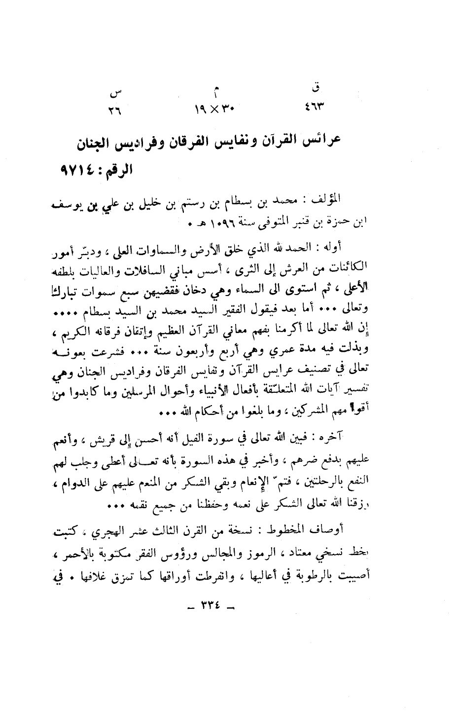 عرائس القرآن ونفائس الفرقان وفراديس الجنان الرقم: 9714
