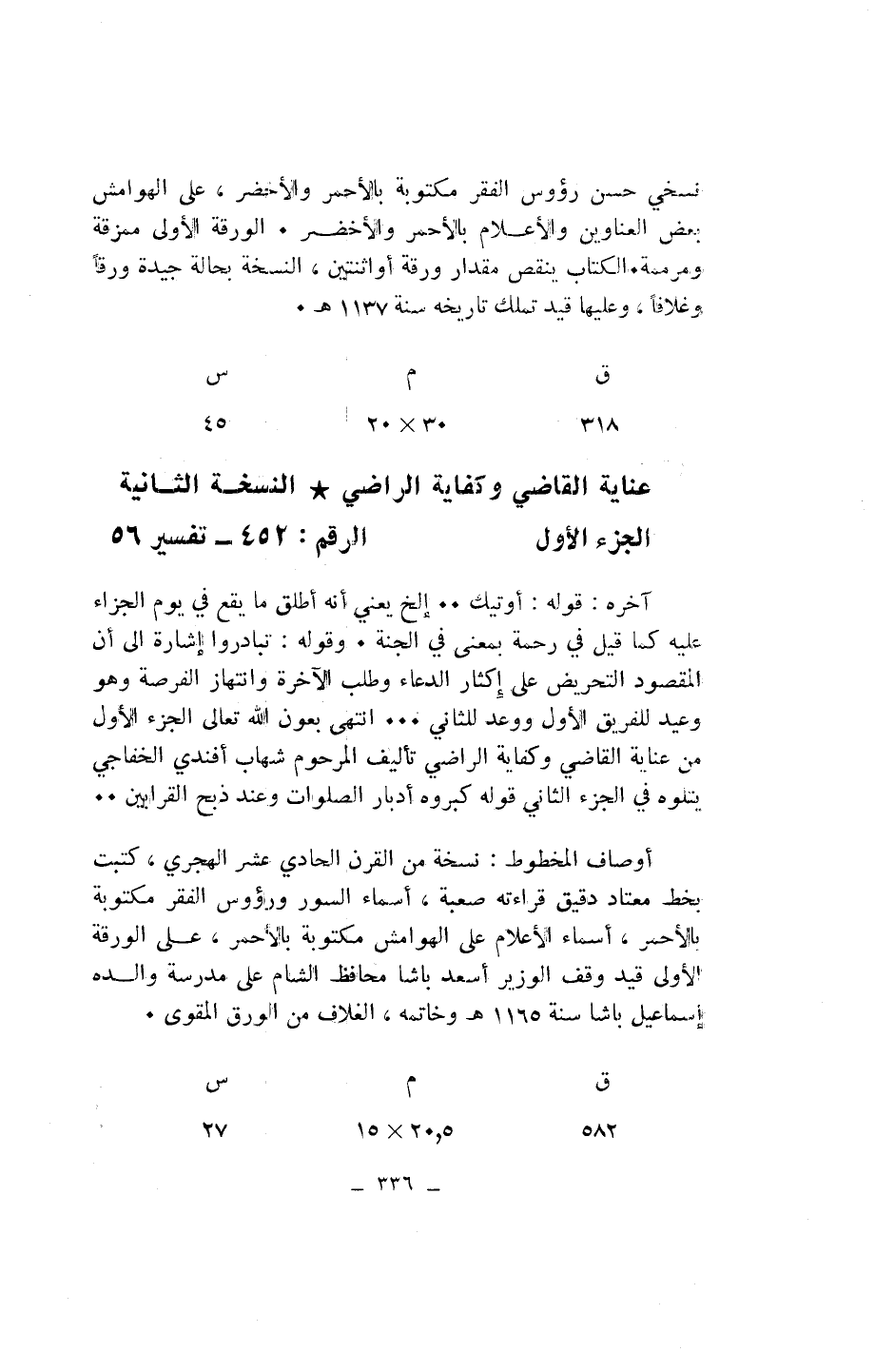 عناية القاضي وكفاية الراضي* النسخة الثانية الجزء الأول الرقم: 452 - تفسير 56