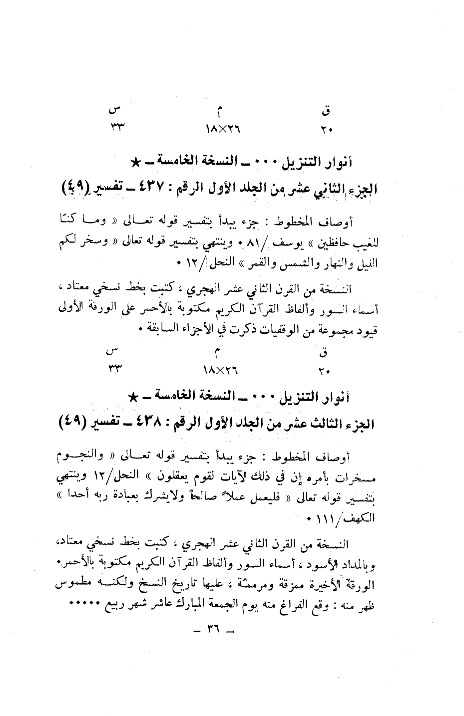 أوصاف المخطوط: جزء يبدأ بتفسير قوله تعالى «وَالنُّجُومُ مُسَخَّراتٌ بِأَمْرِهِ إِنَّ فِي ذلِكَ لَآياتٍ لِقَوْمٍ يَعْقِلُونَ» النحل/ 12 وينتهي بتفسير قوله تعالى «فَلْيَعْمَلْ عَمَلًا صالِحاً وَلا يُشْرِكْ بِعِبادَةِ رَبِّهِ أَحَداً» الكهف/ 111.