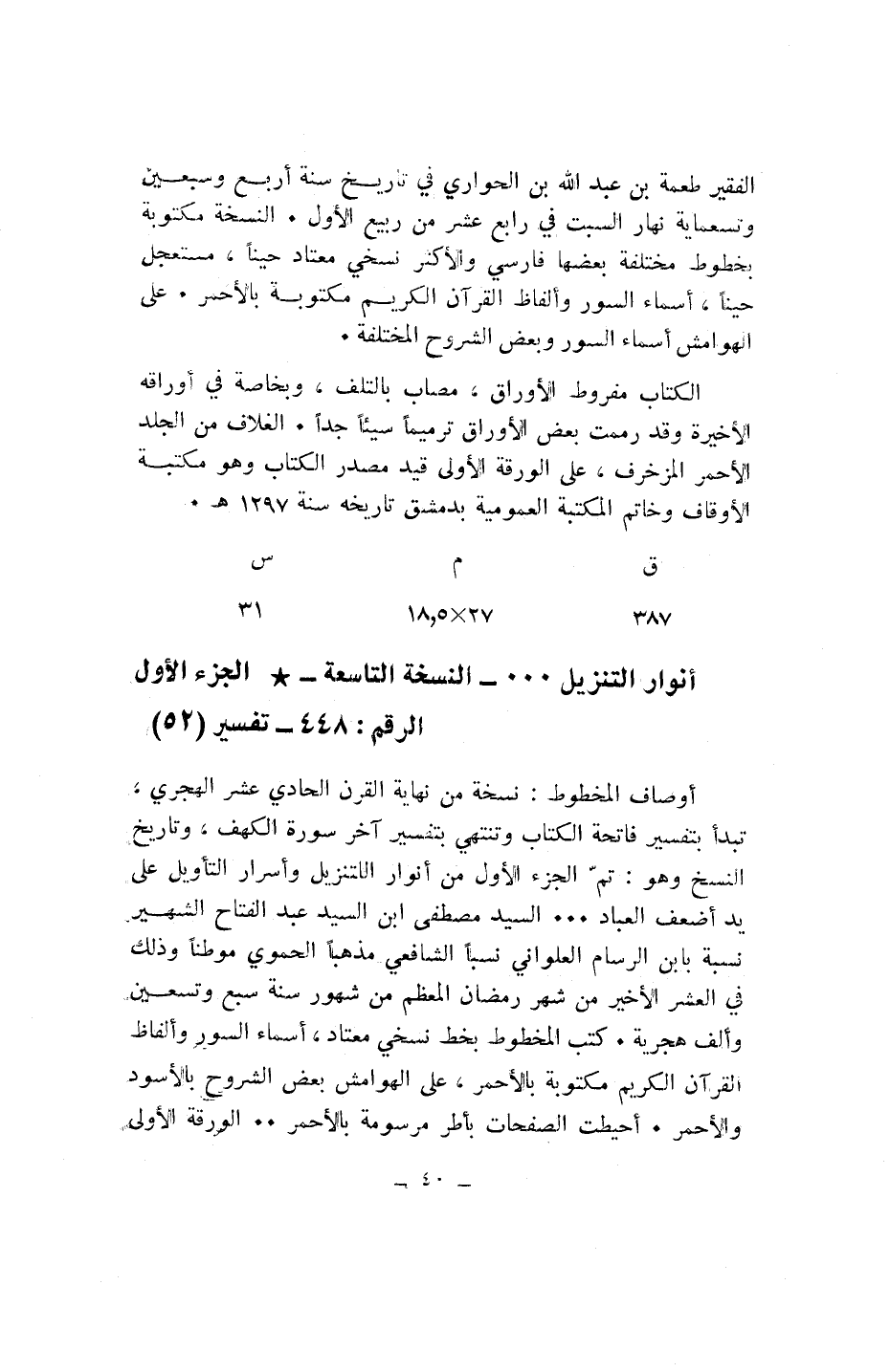 أوصاف المخطوط: نسخة من نهاية القرن الحادي عشر الهجري، تبدأ بتفسير فاتحة الكتاب وتنتهي بتفسير آخر سورة الكهف، وتاريخ النسخ وهو: تمّ الجزء الأول من أنوار التنزيل وأسرار التأويل على يد أضعف العباد ... السيد مصطفى ابن السيد عبد الفتاح الشهير نسبة بابن الرسام العلواني نسبا الشافعي مذهبا الحموي موطنا وذلك في العشر الأخير من شهر رمضان المعظم من شهور سنة سبع وتسعين وألف هجرية. كتب المخطوط بخط نسخي معتاد، أسماء السور وألفاظ القرآن الكريم مكتوبة بالأحمر، على الهوامش بعض الشروح بالأسود والأحمر. أحيطت الصفحات بأطر مرسومة بالأحمر .. الورقة الأولى
