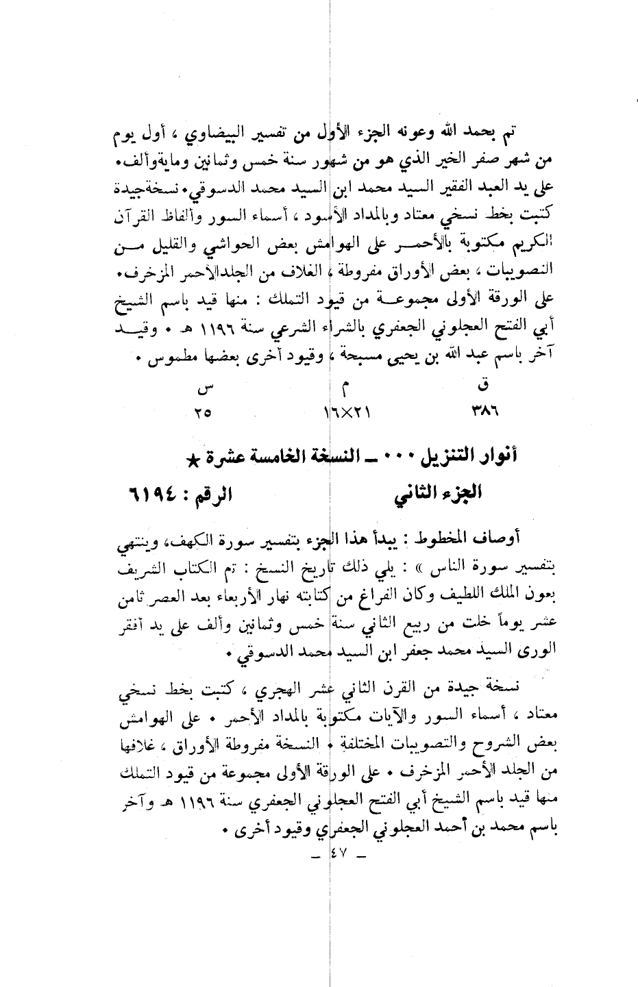 أوصاف المخطوط: يبدأ هذا الجزء بتفسير سورة الكهف، وينتهي بتفسير سورة الناس»: يلي ذلك تاريخ النسخ: تم الكتاب الشريف بعون الملك اللطيف وكان الفراغ من كتابته نهار الأربعاء بعد العصر ثامن عشر يوما خلت من ربيع الثاني سنة خمس وثمانين وألف على يد أفقر الورى السيد محمد جعفر ابن السيد محمد الدسوقي.