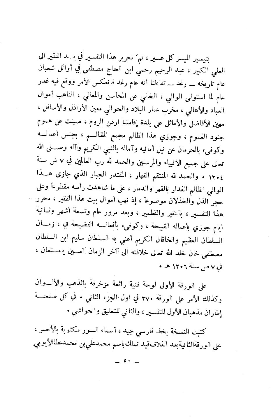 الذي جازى هذا الوالي الظالم الغدار بالقهر والدمار، على ما شاهدت رأسه مقطوعا وعلى حجر الذل والخذلان موضوعا، إذ نهب أموال بيت هذا الفقير، محرر هذا التفسير، بالنقير والقطمير، وبعد مرور عام وتسعة أشهر وثمانية أيام جوزي بأعماله القبيحة، وكوفئ بأفعاله الفضيحة في، زمان السلطان العظيم والخاقان الكريم أعني به السلطان سليم ابن السلطان مصطفى خان خلد الله تعالى خلافته الى آخر الزمان آمين يا مستعان، في 7 ص سنة 1206 هـ.