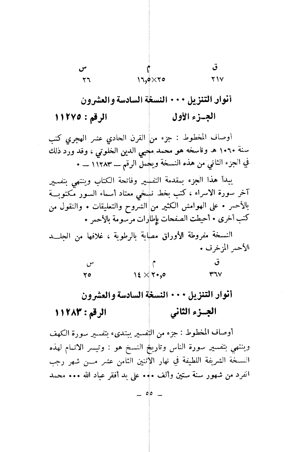 أوصاف المخطوط: جزء من القرن الحادي عشر الهجري كتب سنة 1060 هـ وناسخه هو محمد محيي الدين الخلوتي، وقد ورد ذلك في الجزء الثاني من هذه النسخة ويحمل الرقم- 11283 - .