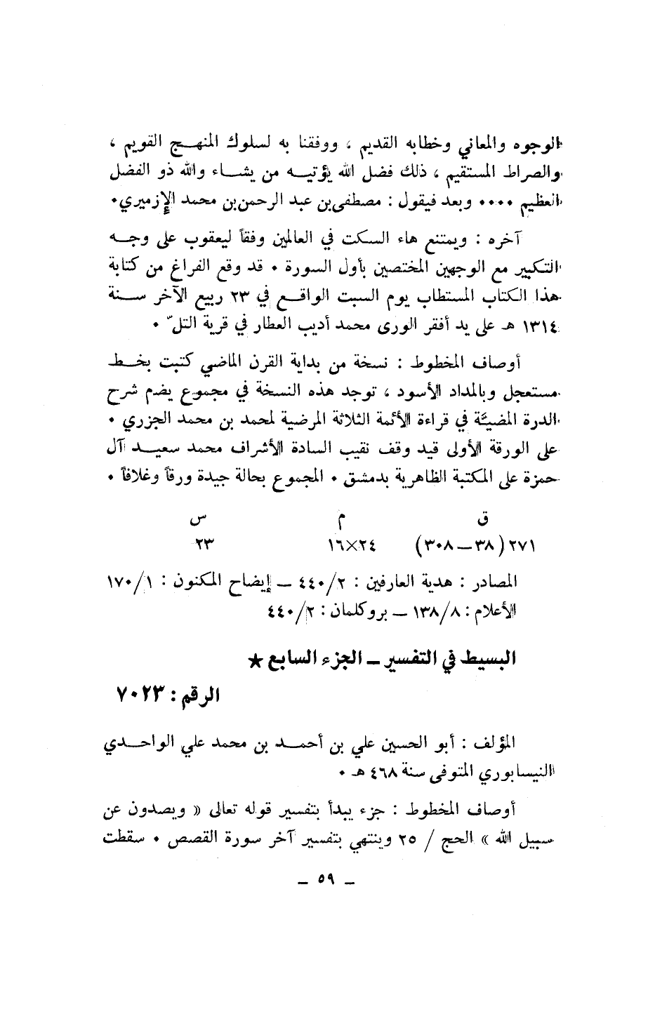 (ق 271 (38 - 308) / م 24* 16/ س 23) المصادر: هدية العارفين: 2/ 440 - إيضاح المكنون: 1/ 170 الأعلام: 8/ 138 - بروكلمان: 2/ 440